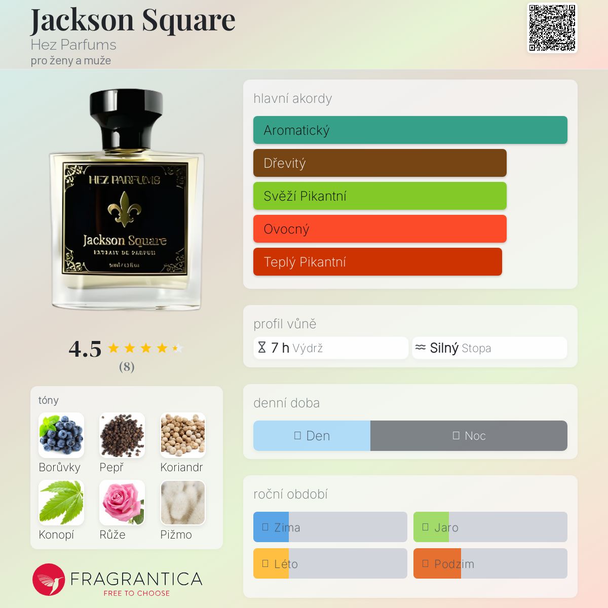 Jackson Square podle Hez Parfums je Orientální Floral vůně pro ženy a muže. Toto je nová vůně. Jackson Square byl/a uveden/a v roce 2024. "Nosem" za touto vůní je Hez Binkowitz. Vrchní tóny jsou Borůvky, Koriandr a Fialkový list; střední tóny jsouČerný pepř, Konopí, Bulharská růže a Konvalinka ; základní tóny jsou Bílé pižmo, Ambra, Santalové dřevo, Pačuli a Bourbonská vanilka.