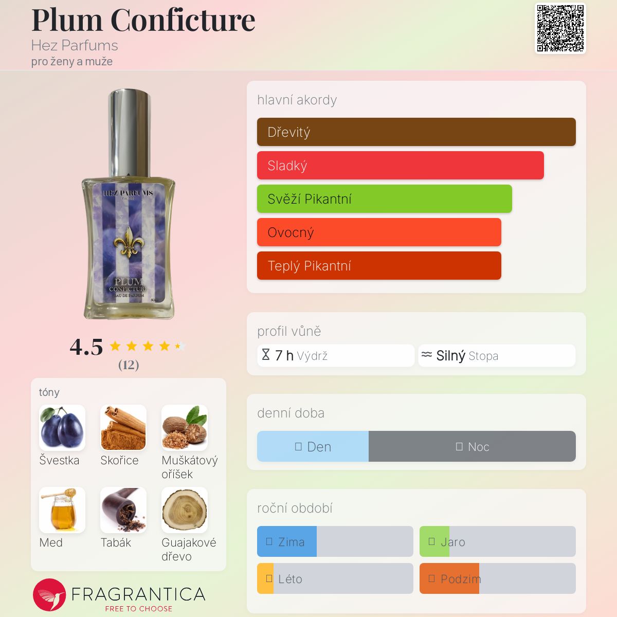Plum Conficture podle Hez Parfums je vůně pro ženy a muže. Plum Conficture byl/a uveden/a v roce 2023. "Nosem" za touto vůní je Hez Binkowitz. Vrchní tóny jsou Švestka, Skořice a Muškátový oříšek; střední tóny jsouMed a Tabák ; základní tóny jsou Guajakové dřevo, Jantarové dřevo a Agarové dřevo (oud).