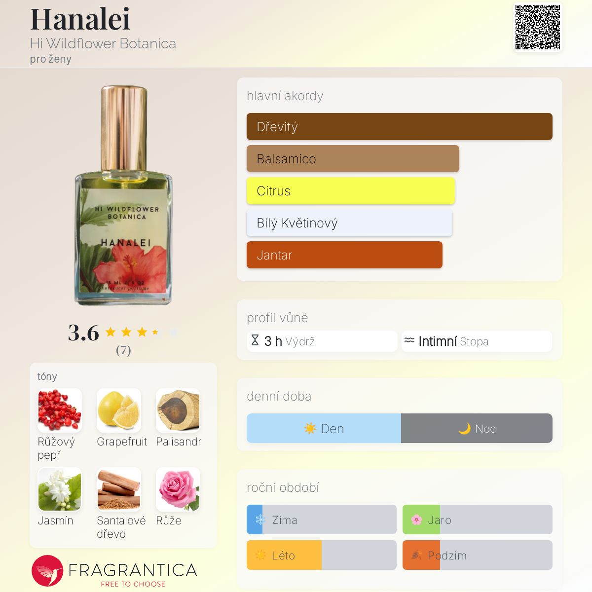 Hanalei podle Hi Wildflower Botanica je Floral Woody Musk vůně pro ženy. Hanalei byl/a uveden/a v roce 2014. "Nosem" za touto vůní je Tanwi Nandini Islam. Vrchní tóny jsou Růžový pepř, Růžový grapefruit a Palisandr; střední tóny jsouJasmín Sambac, Marocká růže a Ylang-Ylang ; základní tóny jsou Santalové dřevo, Peruánský balzám a Bourbonská vanilka.