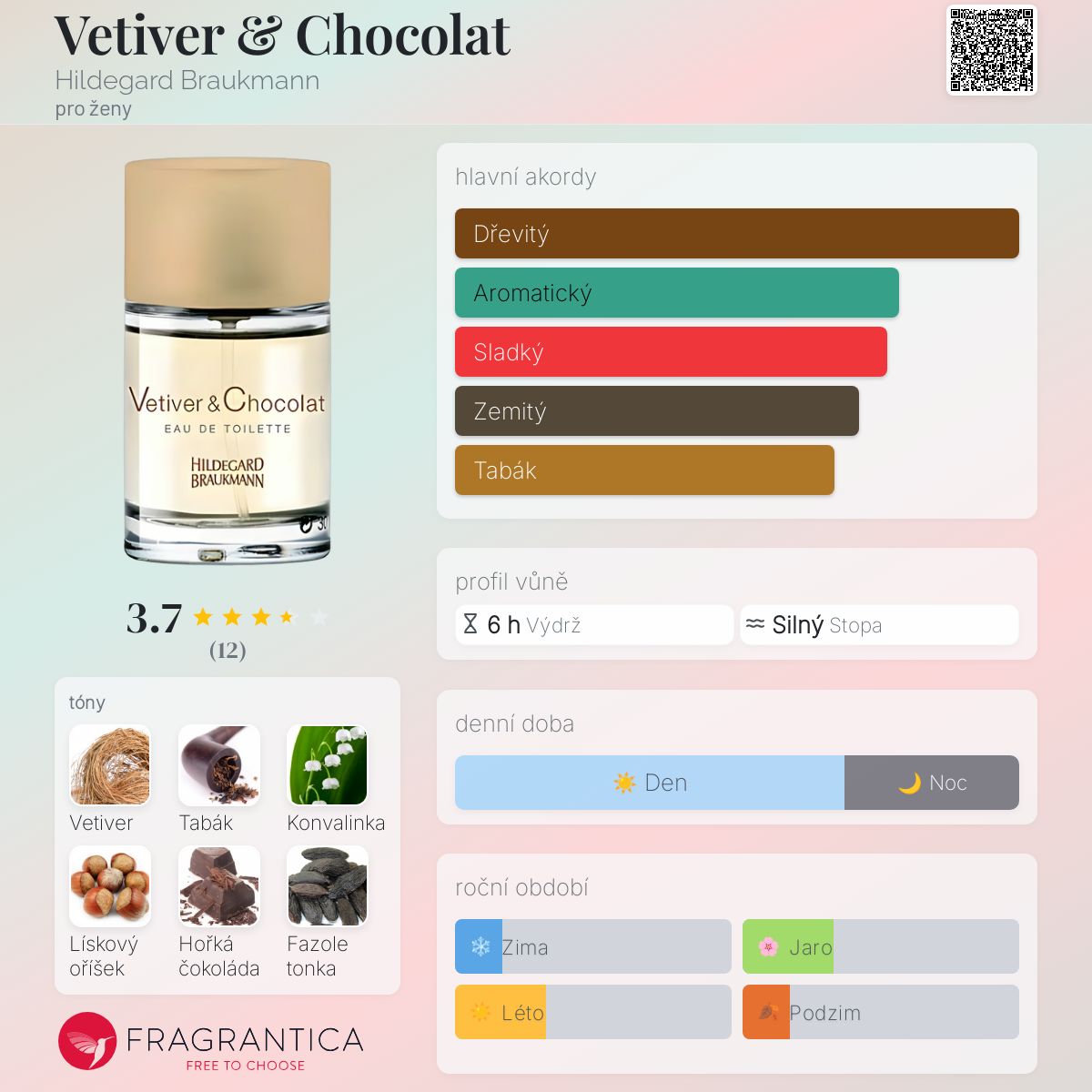 Vetiver & Chocolat podle Hildegard Braukmann je Aromatic Spicy vůně pro ženy. Vrchní tóny jsou Konvalinka a Lískový oříšek; střední tóny jsouVetiver, Hořká čokoláda a Půdní tinktura ; základní tóny jsou Tabák, Fazole tonka, Santalové dřevo a Vanilka.