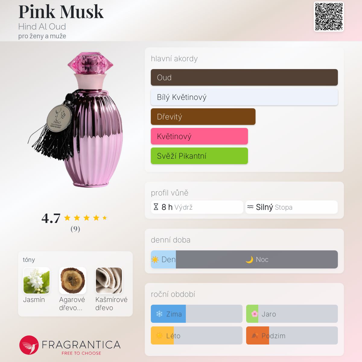 Pink Musk podle Hind Al Oud je Orientální Floral vůně pro ženy a muže. Pink Musk byl/a uveden/a v roce 2021. Vrchní tón je Jasmín ; střední tón jeKašmírové dřevo ; základní tón je Agarové dřevo (oud).