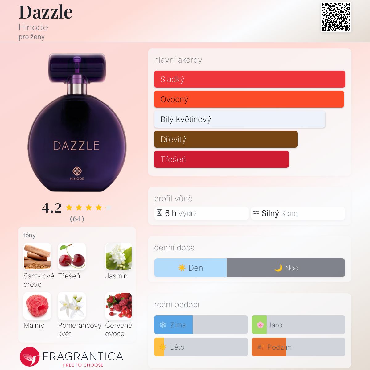 Dazzle podle Hinode je Floral vůně pro ženy. Vrchní tóny jsou Třešeň, Maliny, Červené ovoce, Jahoda a Bergamot; střední tóny jsouJasmín, Pomerančový květ a Růže ; základní tóny jsou Santalové dřevo, Jantar (ambra), Fazole tonka, Pižmo a Vanilka.