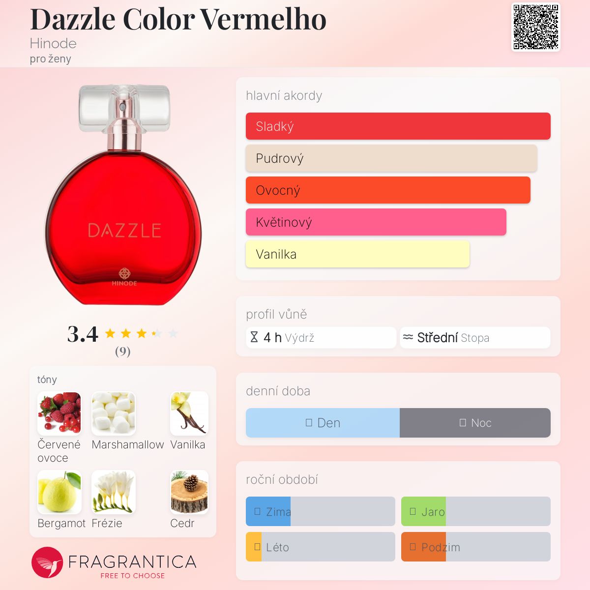 Dazzle Color Vermelho podle Hinode je Orientální Vanilla vůně pro ženy. Dazzle Color Vermelho byl/a uveden/a v roce 2019. Vrchní tóny jsou Červené ovoce, Bergamot, Frézie a Fialka; střední tóny jsouMarshamallow, Růže, Pivoňka a Jasmín ; základní tóny jsou Vanilka, Cedr, Jantar (ambra) a Pižmo.