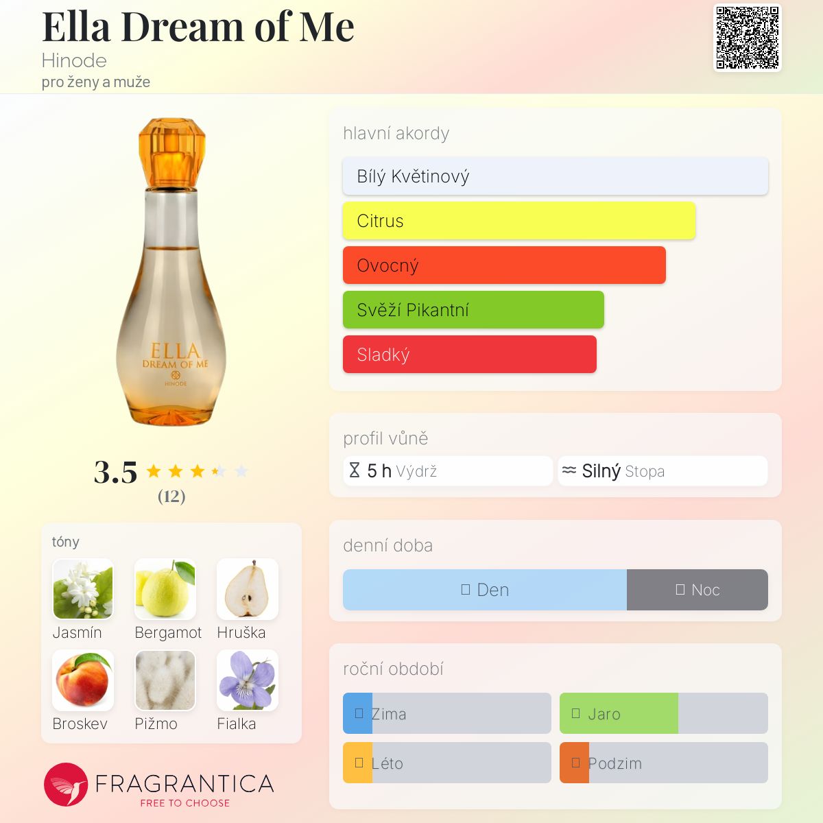 Ella Dream of Me podle Hinode je Floral Fruity vůně pro ženy a muže. Ella Dream of Me byl/a uveden/a v roce 2019. Vrchní tóny jsou Bergamot, Hruška a Ananas; střední tóny jsouJasmín, Broskev a Fialka ; základní tóny jsou Pižmo, Santalové dřevo a Extrakt z bílého cedru.