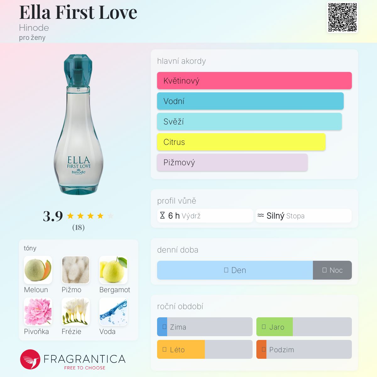 Ella First Love podle Hinode je Floral Fruity vůně pro ženy. Vrchní tóny jsou Meloun, Bergamot a Grapefruit; střední tóny jsouPivoňka, Frézie a Vodnaté tóny ; základní tóny jsou Bílé pižmo a Cedr.