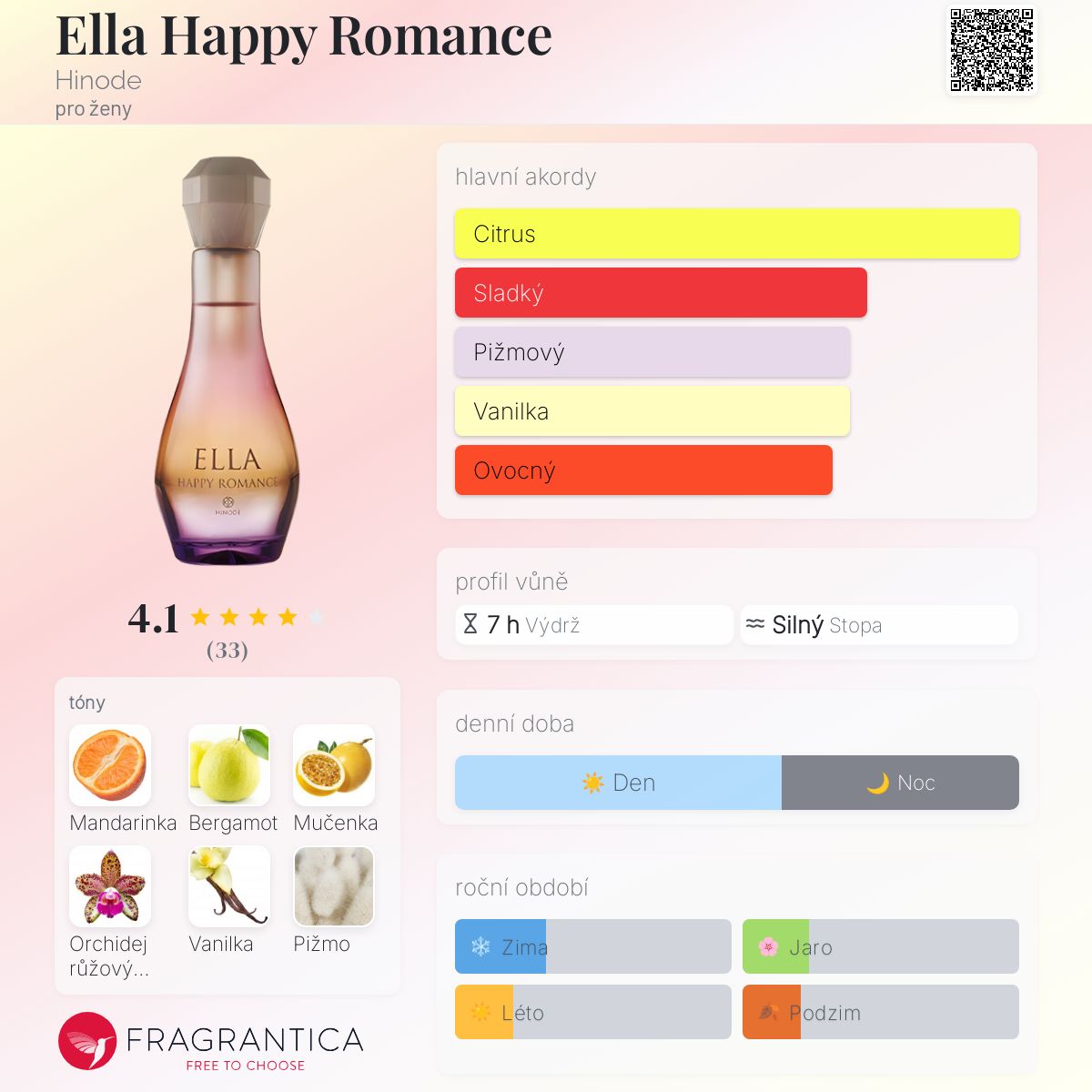 Ella Happy Romance podle Hinode je vůně pro ženy. Vrchní tóny jsou Mandarinka a Bergamot; střední tóny jsouMučenka a Orchidej růžový leopard ; základní tóny jsou Vanilka a Přírodní pižmo.