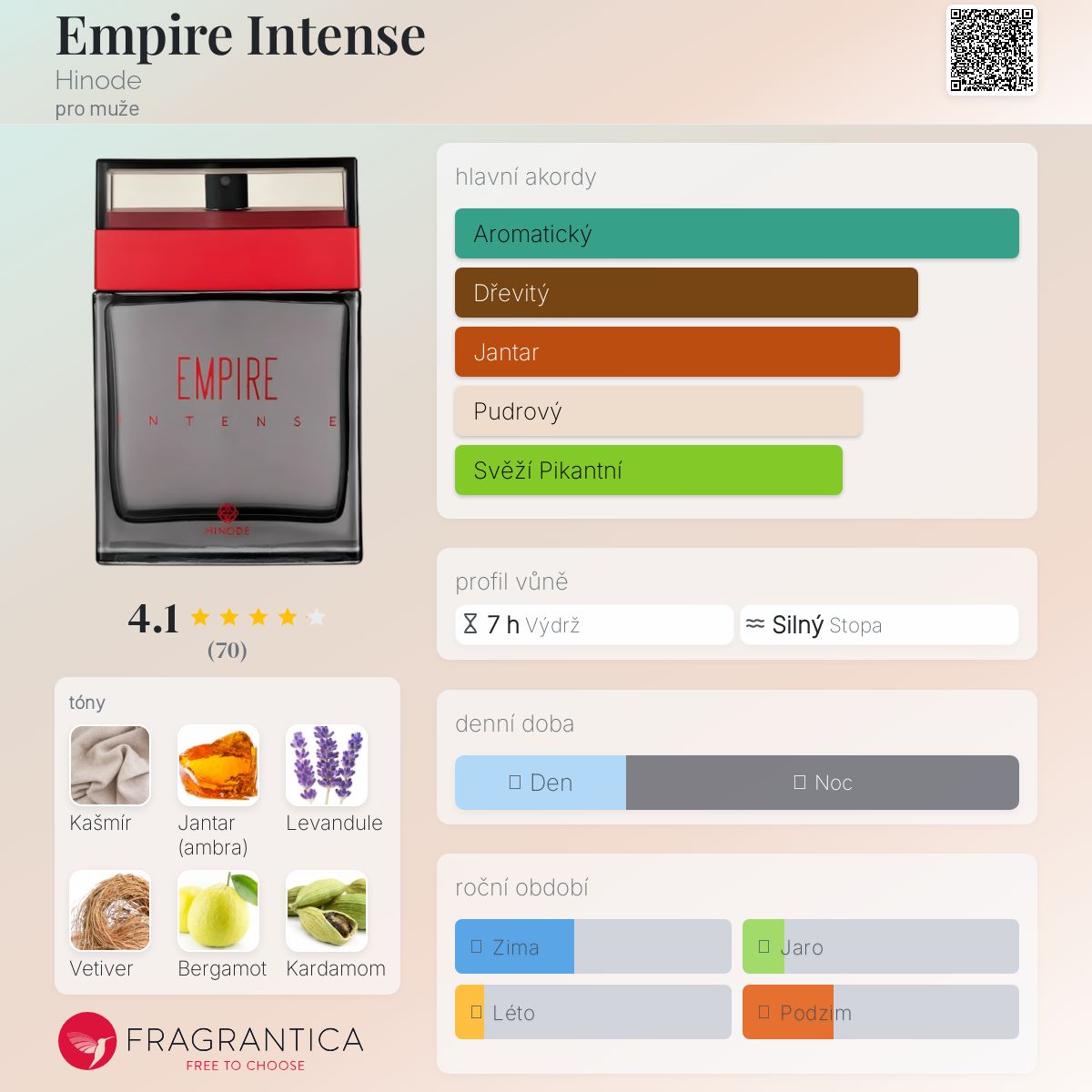 Empire Intense podle Hinode je Aromatic vůně pro muže. Empire Intense byl/a uveden/a v roce 2015. "Nosem" za touto vůní je Jérôme Epinette. Vrchní tóny jsou Levandule, Bergamot a Kardamom; střední tóny jsouElimi, Fialka a Pelargónie ; základní tóny jsou Kašmír, Jantar (ambra) a Vetiver.
