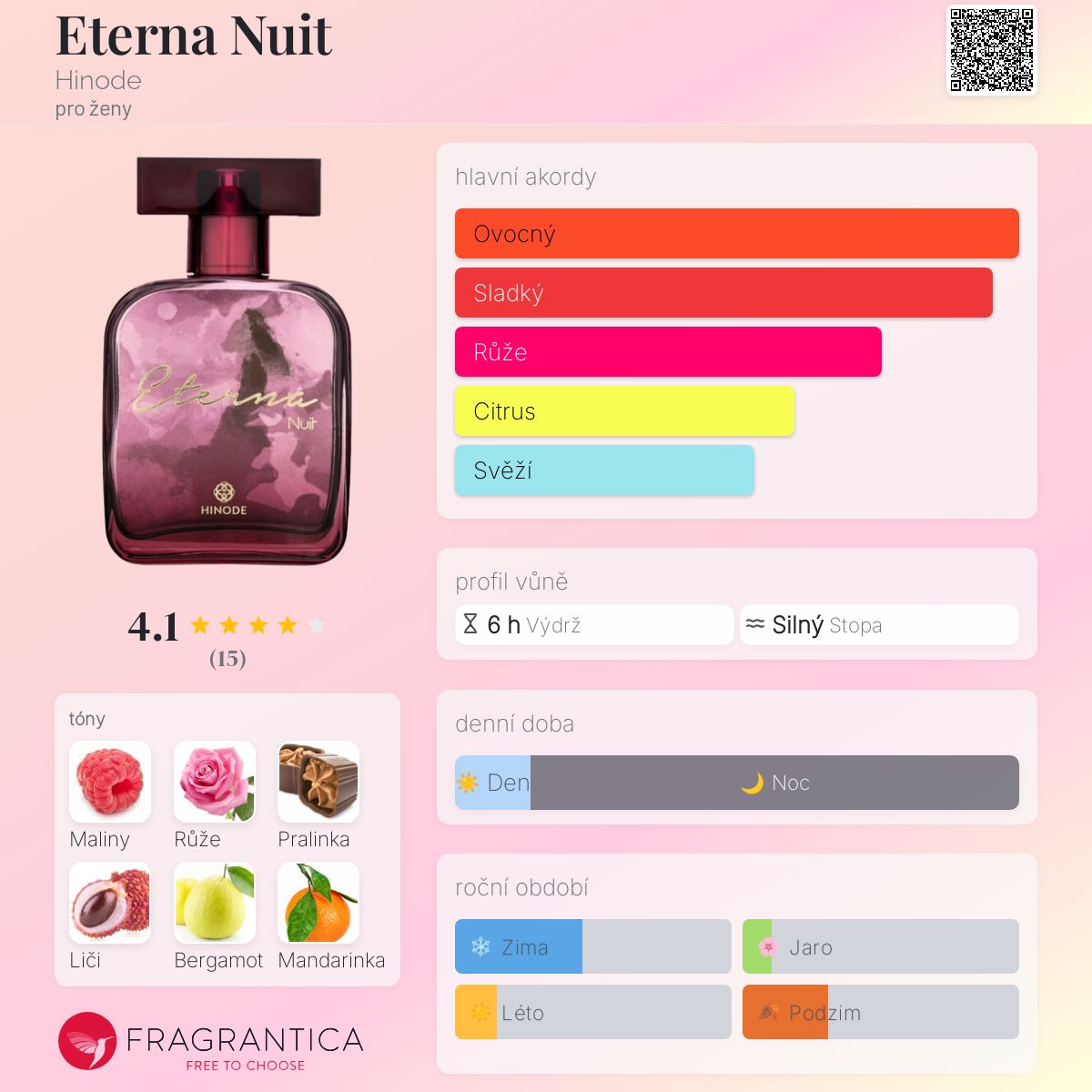 Eterna Nuit podle Hinode je Orientální Floral vůně pro ženy. Eterna Nuit byl/a uveden/a v roce 2018. Vrchní tóny jsou Maliny, Liči, Bergamot, Mandarinka, Ostružina a Jablko; střední tóny jsouČerná růže a Jasmín ; základní tóny jsou Pralinka, Vanilka, Bílé pižmo a Pačuli.