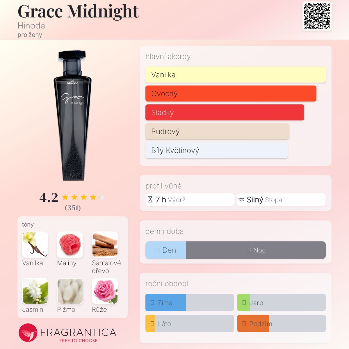 Grace Midnight podle Hinode je Orientální Floral vůně pro ženy. "Nosem" za touto vůní je Elisabeth Maier. Vrchní tóny jsou Maliny, Mandarinka a Jablko; střední tóny jsouJasmín, Růže a Konvalinka ; základní tóny jsou Vanilka, Santalové dřevo a Pižmo.