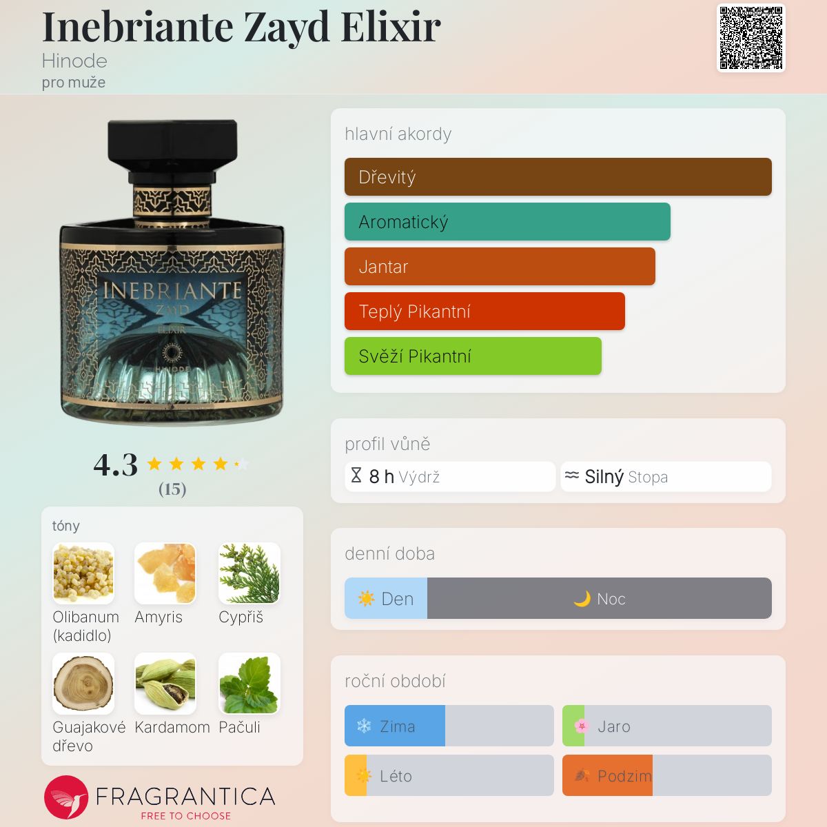 Inebriante Zayd Elixir podle Hinode je Woody vůně pro muže. Toto je nová vůně. Inebriante Zayd Elixir byl/a uveden/a v roce 2025. Vrchní tóny jsou Kardamom, Bergamot a Mandarinka; střední tóny jsouKadidlo, Amyris a Cypřiš ; základní tóny jsou Guajakové dřevo, Pačuli a Jantar (ambra).