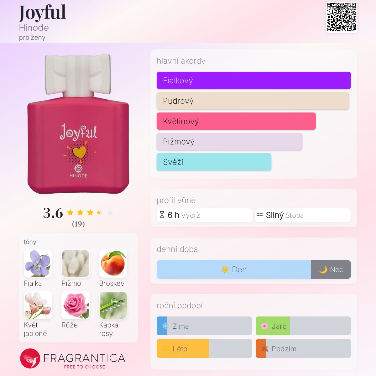 Joyful podle Hinode je Floral Fruity vůně pro ženy. Joyful byl/a uveden/a v roce 2018. Vrchní tóny jsou Broskev, Mandarinka a Frézie; střední tóny jsouKvět jabloně , Růže, Kapka rosy a Leknín ; základní tóny jsou Fialka, Pižmo a Santalové dřevo.