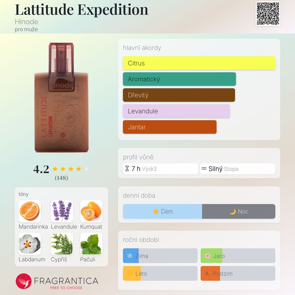Lattitude Expedition podle Hinode je vůně pro muže. Lattitude Expedition byl/a uveden/a v roce 2017. Vrchní tóny jsou Mandarinka a Kumquat; střední tóny jsouLevandule a Labdanum ; základní tóny jsou Cypřiš a Pačuli.