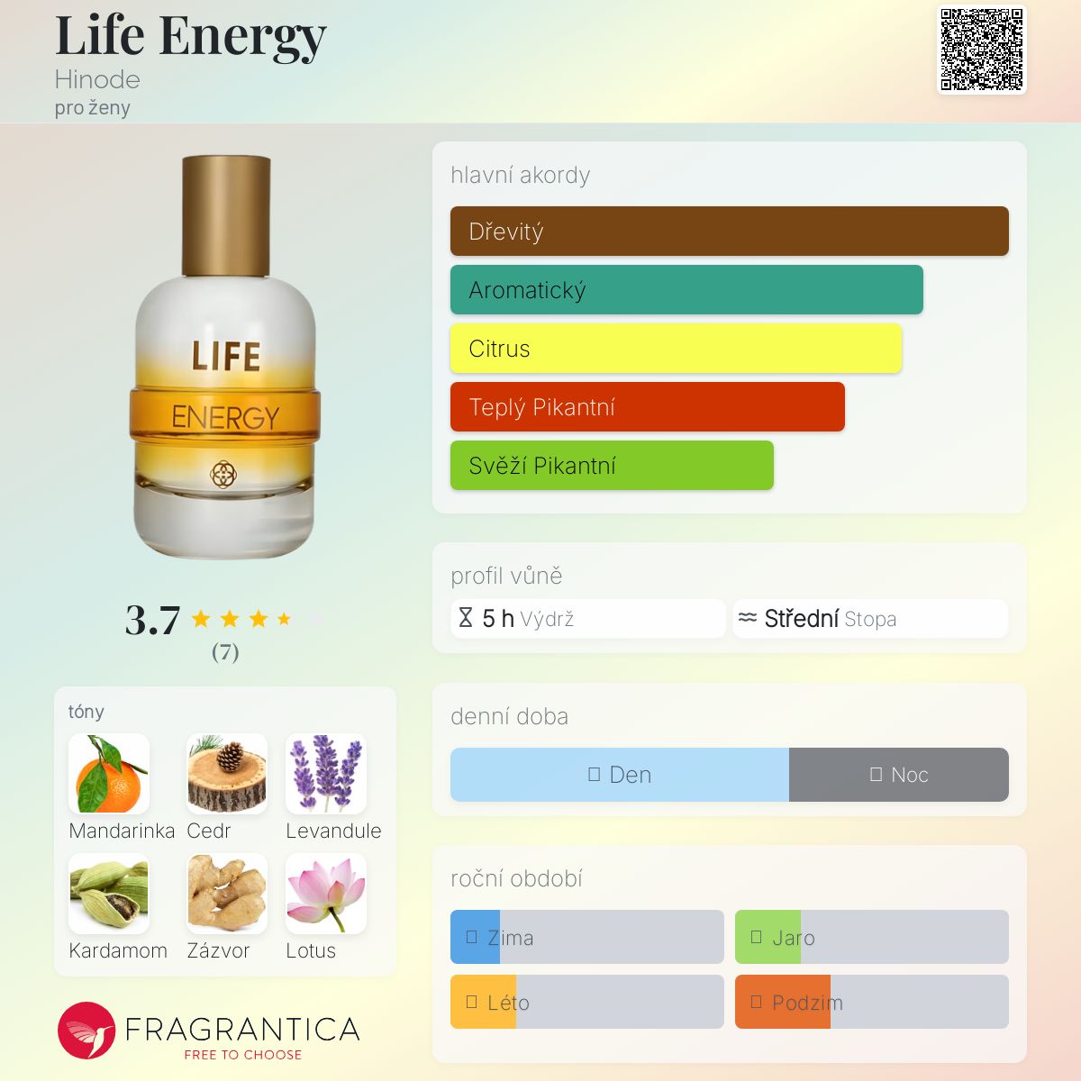 Life Energy podle Hinode je Aromatic Fruity vůně pro ženy. Life Energy byl/a uveden/a v roce 2021. Vrchní tóny jsou Mandarinka, Levandule, Kardamom a Zázvor; střední tóny jsouLotus, Cypřiš a Jalovcové bobulky ; základní tóny jsou Cedr, Vetiver a Pačuli.