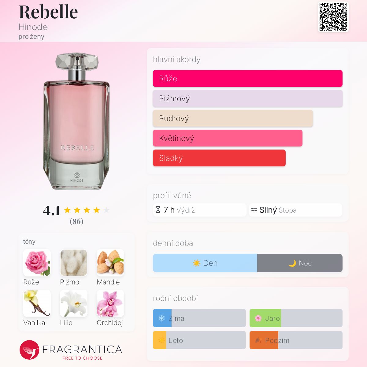 Rebelle podle Hinode je Floral vůně pro ženy. Rebelle byl/a uveden/a v roce 2018. "Nosem" za touto vůní je Jérôme Epinette. Vrchní tóny jsou Turecká růže a Lilie; střední tóny jsouMandle a Orchidej ; základní tóny jsou Bílé pižmo a Vanilka.