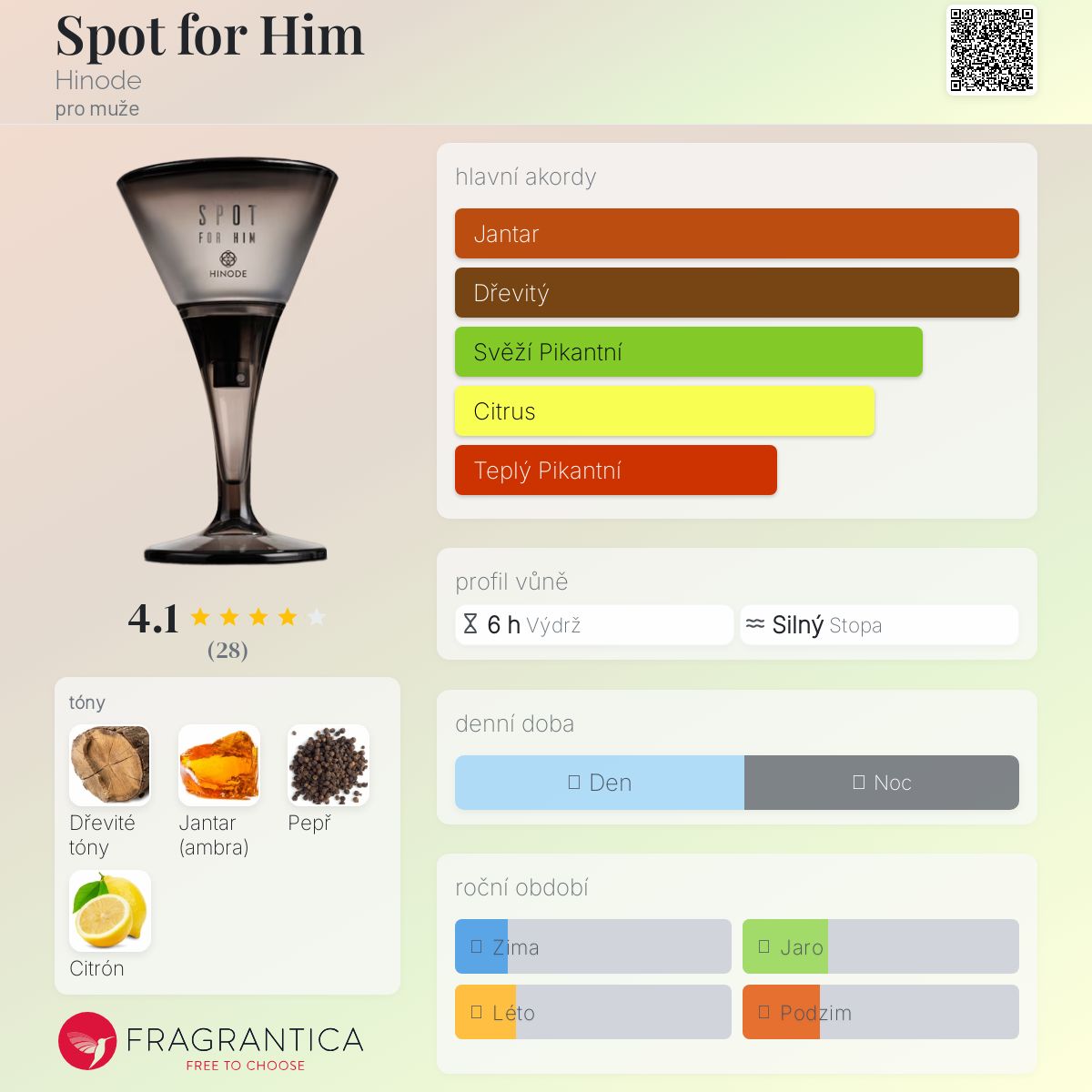 Spot for Him podle Hinode je Aromatic Spicy vůně pro muže. Spot for Him byl/a uveden/a v roce 2020. Vrchní tón je Citrón ; střední tón jeČerný pepř ; základní tóny jsou Dřevité tóny a Jantar (ambra).