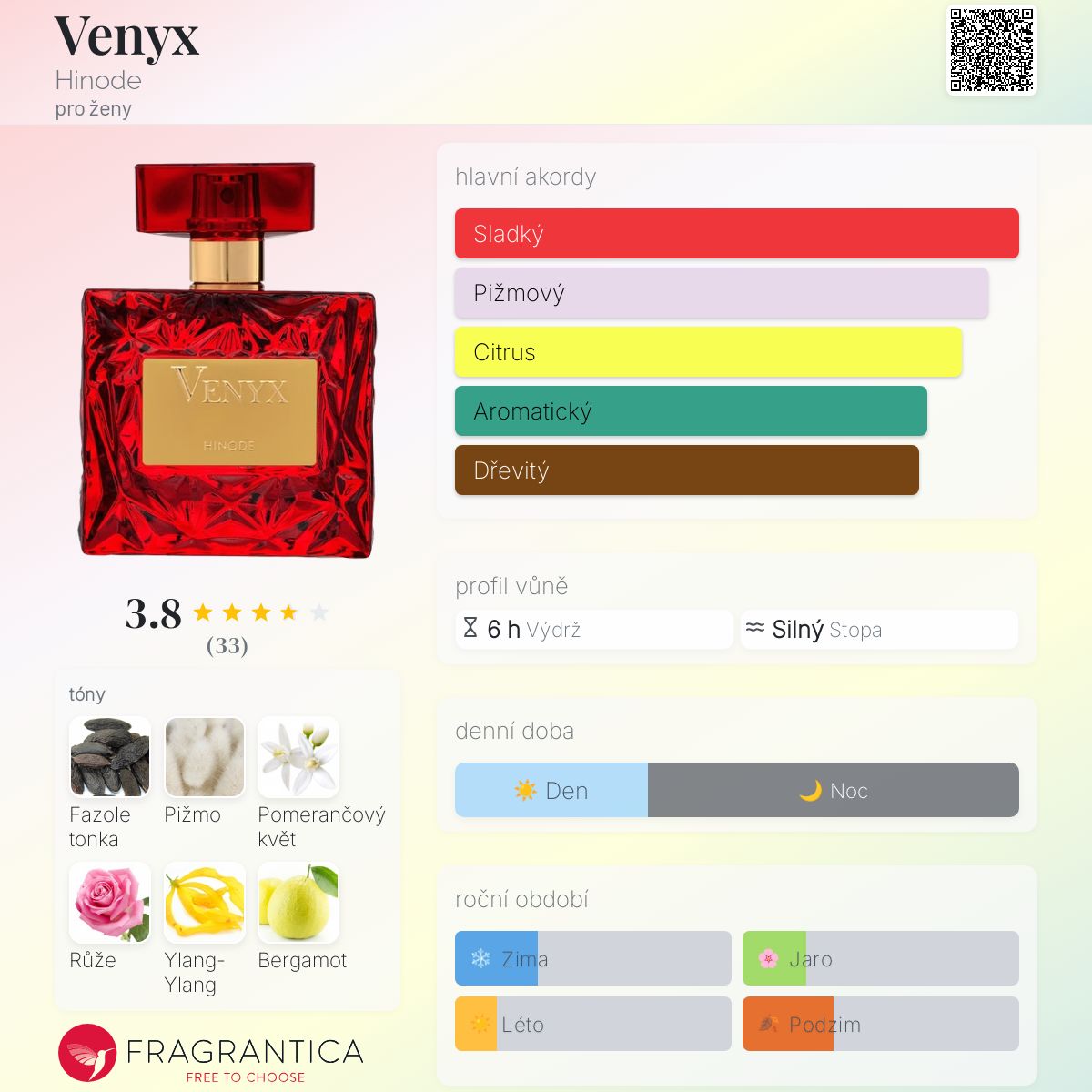 Venyx podle Hinode je Chypre Floral vůně pro ženy. Venyx byl/a uveden/a v roce 2018. Vrchní tóny jsou Pomerančový květ a Bergamot; střední tóny jsouRůže, Ylang-Ylang a Frézie ; základní tóny jsou Fazole tonka, Pižmo, Vetiver, Mech a Pačuli.