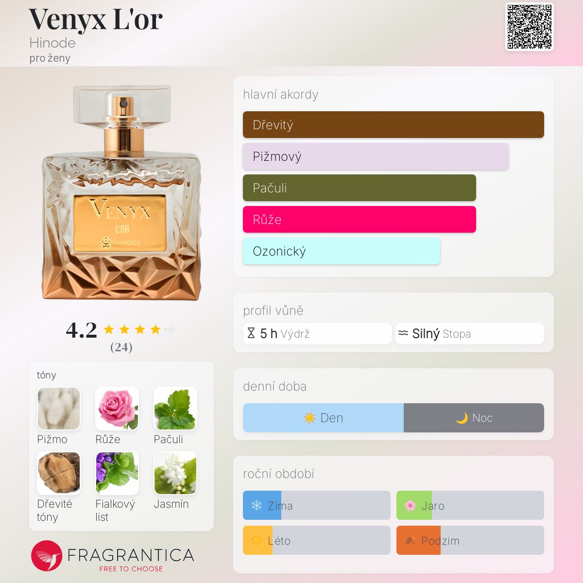 Venyx L'or podle Hinode je Floral Woody Musk vůně pro ženy. Venyx L'or byl/a uveden/a v roce 2020. Vrchní tón je Fialkové listy ; střední tóny jsouRůže a Jasmín Sambac ; základní tóny jsou Pižmo, Pačuli a Dřevité tóny.