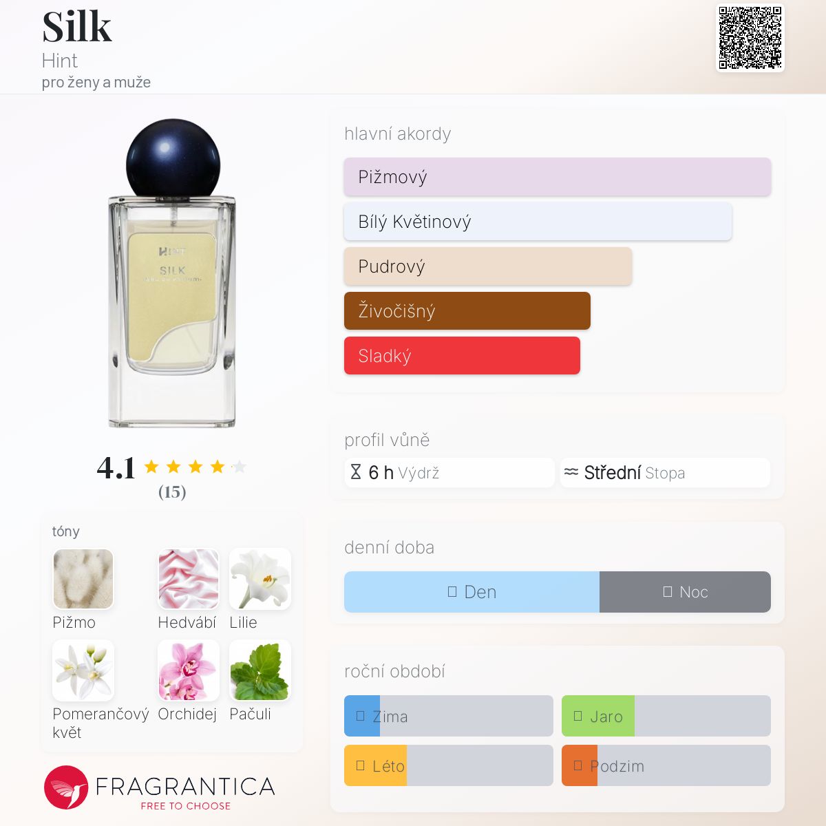 Silk podle Hint je vůně pro ženy a muže. Toto je nová vůně. Silk byl/a uveden/a v roce 2024. Vrchní tóny jsou Hedvábí, Černý pepř a Bergamot; střední tóny jsouLilie, Pomerančový květ a Orchidej ; základní tóny jsou Kašmírové pižmo, Pačuli a Bílý jantar (ambra).