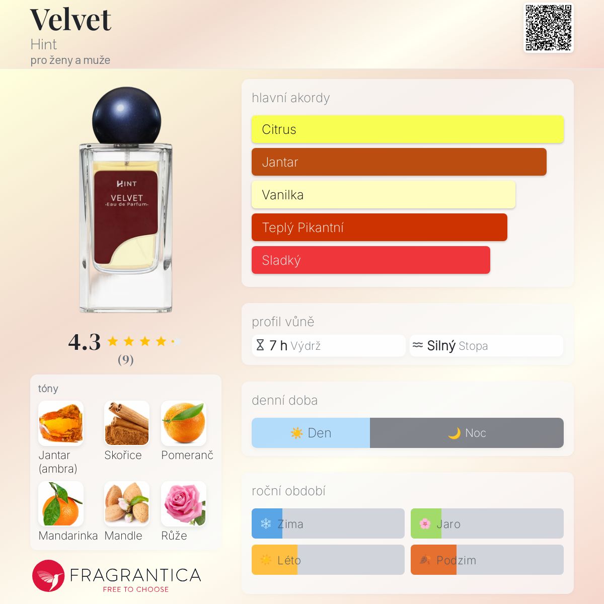 Velvet podle Hint je Orientální Floral vůně pro ženy a muže. Velvet byl/a uveden/a v roce 2024. Vrchní tóny jsou Skořice, Mandarinka a Mandle; střední tóny jsouJantar (ambra), Pomeranč a Růže ; základní tóny jsou Santalové dřevo, Fazole tonka a Vanilka.