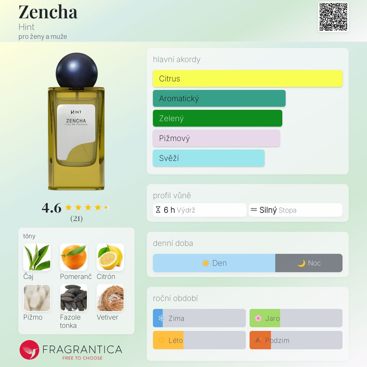 Zencha podle Hint je Citrus Aromatic vůně pro ženy a muže. Toto je nová vůně. Zencha byl/a uveden/a v roce 2024. "Nosem" za touto vůní je Shinichiro Oba. Vrchní tóny jsou Pomeranč, Citrón a Růžový pepř; střední tóny jsouČaj, Orris a Šalvěj muškátová ; základní tóny jsou Pižmo, Fazole tonka, Vetiver a Cedr.