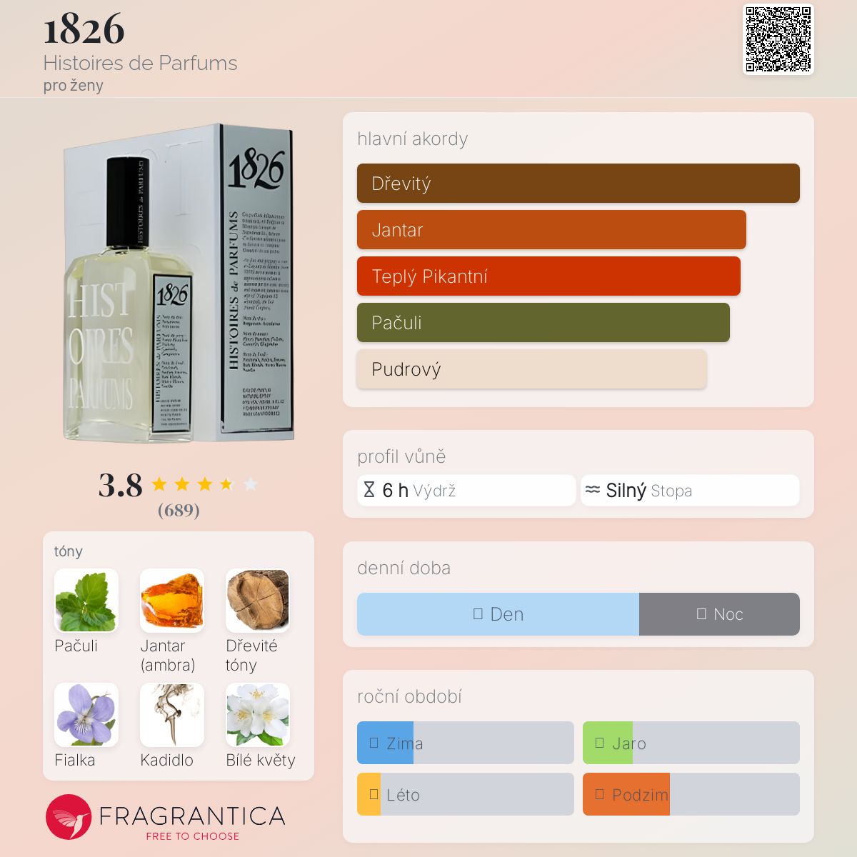 1826 podle Histoires de Parfums je Orientální vůně pro ženy. 1826 byl/a uveden/a v roce 2001. "Nosem" za touto vůní je Sylvie Jourdet. Vrchní tóny jsou Mandarinka a Bergamot; střední tóny jsouFialka, Bílé květy, Skořice a Zázvor ; základní tóny jsou Pačuli, Jantar (ambra), Dřevité tóny, Kadidlo, Pižmo a Vanilka.