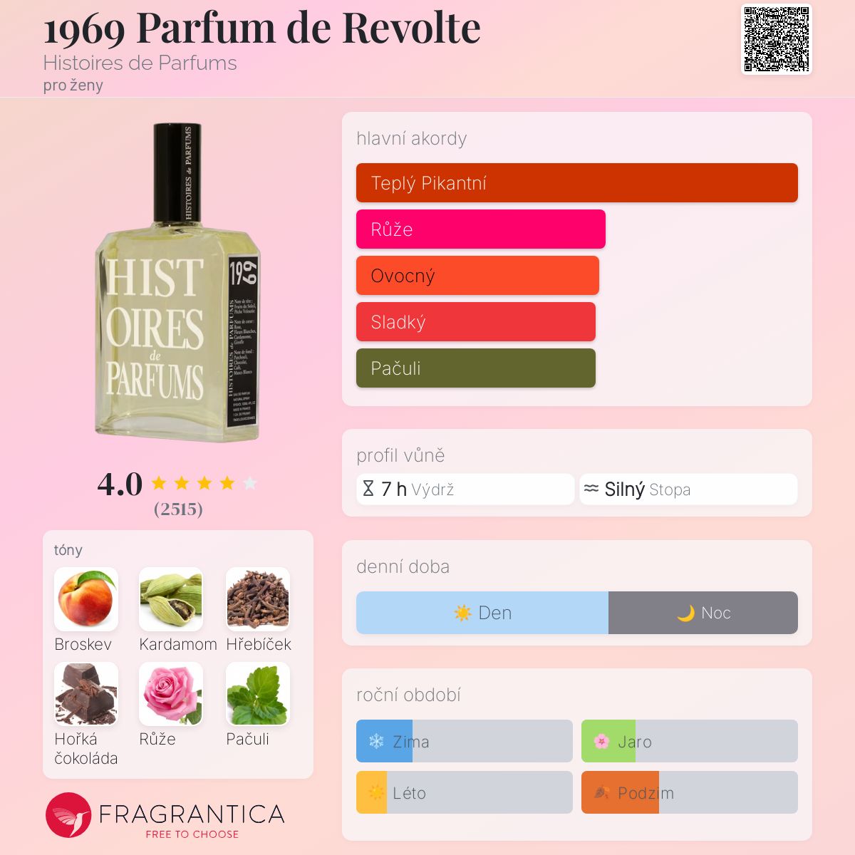 1969 Parfum de Revolte podle Histoires de Parfums je Orientální Spicy vůně pro ženy. 1969 Parfum de Revolte byl/a uveden/a v roce 2001. 1969 Parfum de Revolte byl/a vytvořen/a Gerald Ghislain a Sylvie Jourdet. Vrchní tón je Broskev ; střední tóny jsouKardamom, Hřebíček, Růže a Bílé květy ; základní tóny jsou Mexická čokoláda, Pačuli, Káva a Pižmo.