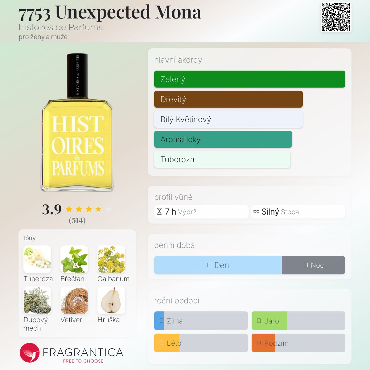 7753 Unexpected Mona podle Histoires de Parfums je Orientální Floral vůně pro ženy a muže. 7753 Unexpected Mona byl/a uveden/a v roce 2019. Vrchní tóny jsou Břečťan, Galbanum, Mandarinka, Bergamot a Pepř; střední tóny jsouTuberóza, Hruška, Pomerančový květ, Černý rybíz a Otočník ; základní tóny jsou Dubový mech, Vetiver, Santalové dřevo a Pačuli.