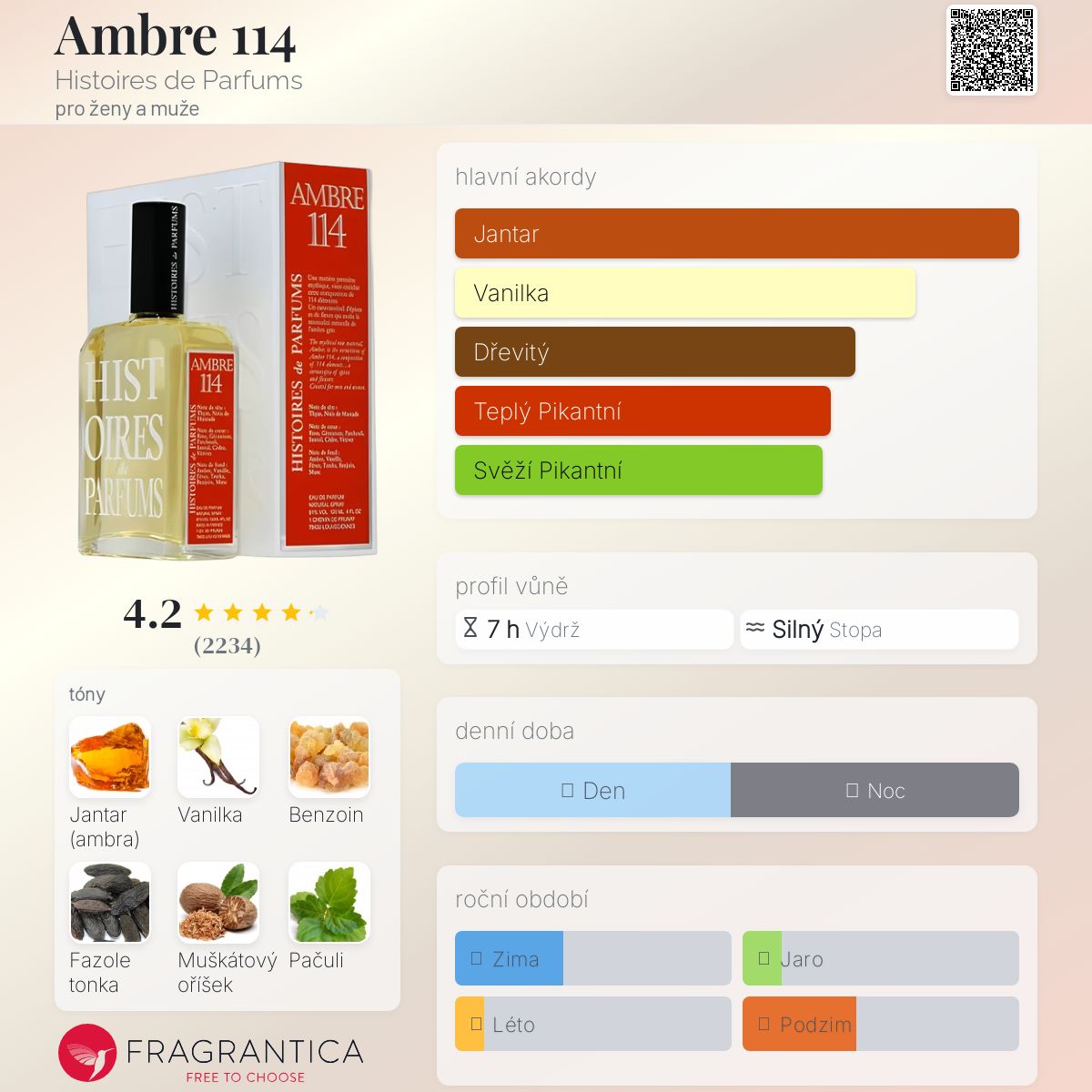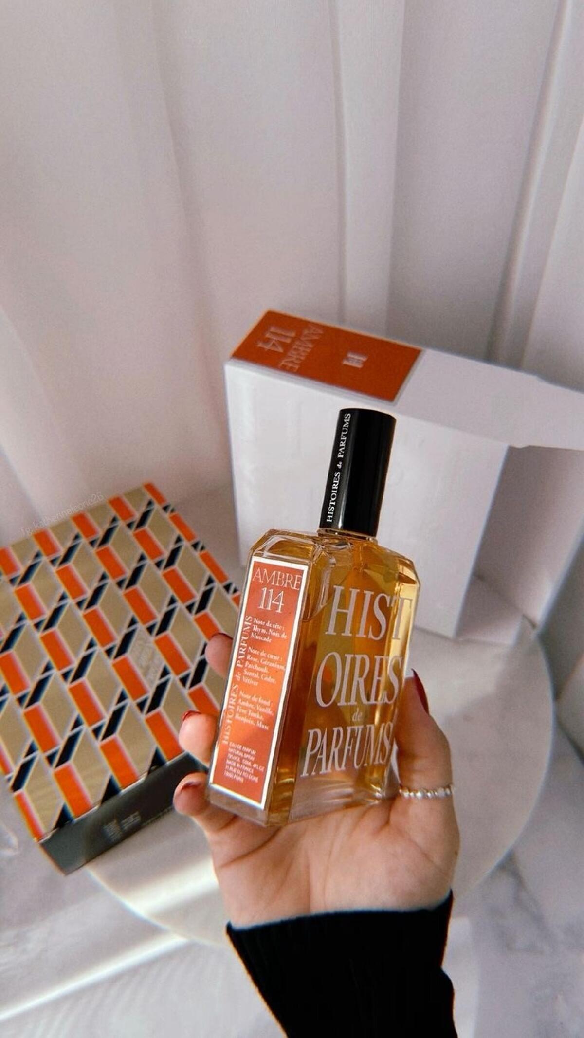 Ambre 114 podle Histoires de Parfums je Orientální Spicy vůně pro ženy a muže. Ambre 114 byl/a uveden/a v roce 2001. Ambre 114 byl/a vytvořen/a Gerald Ghislain, Magali Senequier a Sylvie Jourdet. Vrchní tóny jsou Muškátový oříšek a Tymián; střední tóny jsouPačuli, Santalové dřevo, Růže, Pelargónie, Cedr a Vetiver ; základní tóny jsou Jantar (ambra), Vanilka, Benzoin, Fazole tonka a Pižmo.