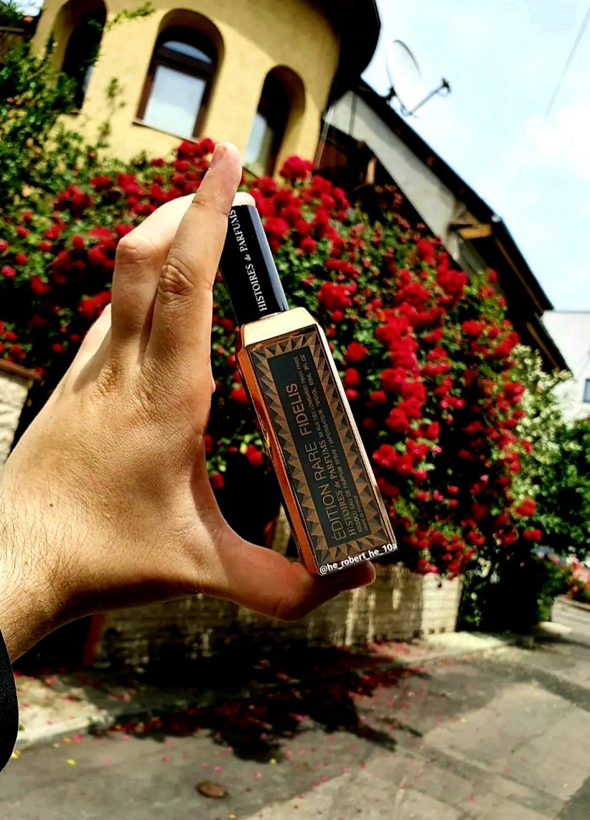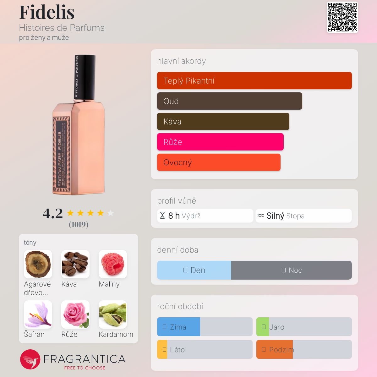 Fidelis podle Histoires de Parfums je Chypre Floral vůně pro ženy a muže. Fidelis byl/a uveden/a v roce 2015. "Nosem" za touto vůní je Julien Rasquinet. Vrchní tóny jsou Káva, Šafrán, Kardamom a Kmín; střední tóny jsouMaliny a Růže ; základní tóny jsou Agarové dřevo (oud), Jantar (ambra) a Pačuli.