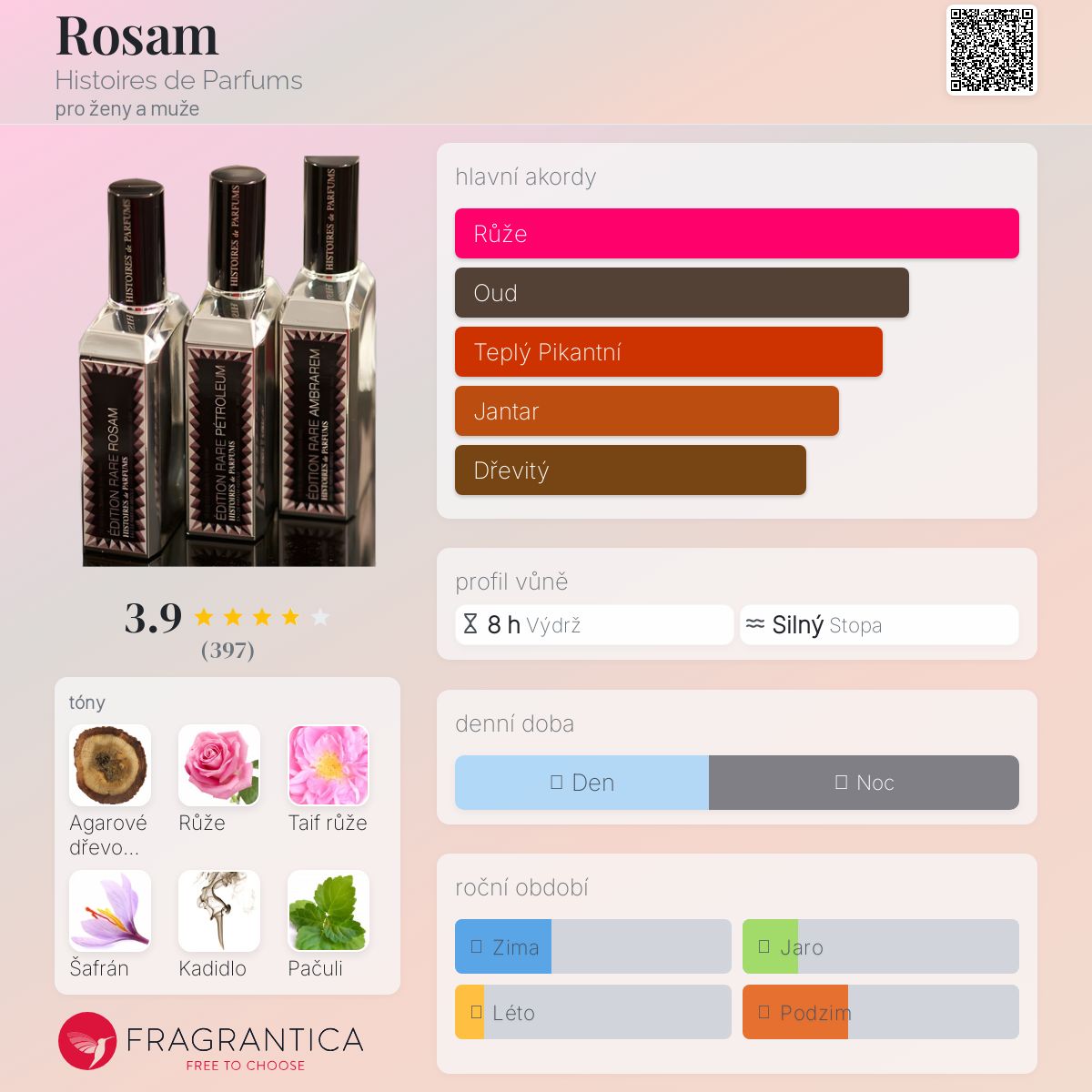Rosam podle Histoires de Parfums je Orientální Floral vůně pro ženy a muže. Rosam byl/a uveden/a v roce 2011. "Nosem" za touto vůní je Gerald Ghislain. Vrchní tóny jsou Růže a Citrusy; střední tóny jsouTaif růže, Šafrán a Kadidlo ; základní tóny jsou Agarové dřevo (oud), Pačuli, Santalové dřevo a Jantar (ambra).