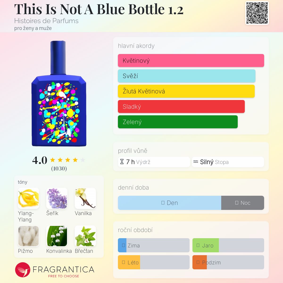 This Is Not A Blue Bottle 1.2 podle Histoires de Parfums je Floral Woody Musk vůně pro ženy a muže. This Is Not A Blue Bottle 1.2 byl/a uveden/a v roce 2017. "Nosem" za touto vůní je Luca Maffei. Vrchní tóny jsou Břečťan a Růžový pepř; střední tóny jsouYlang-Ylang, Šeřík a Konvalinka ; základní tóny jsou Vanilka, Bílé pižmo a Santalové dřevo.