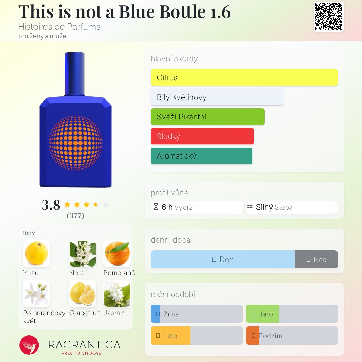 This is not a Blue Bottle 1.6 podle Histoires de Parfums je Floral Fruity vůně pro ženy a muže. This is not a Blue Bottle 1.6 byl/a uveden/a v roce 2020. "Nosem" za touto vůní je Sylvie Jourdet. Vrchní tóny jsou Yuzu, Pomeranč a Grapefruit; střední tóny jsouNeroli, Pomerančový květ, Jasmín, Lotus a Pelargónie ; základní tóny jsou Bílé pižmo, Vetiver a Vanilka.