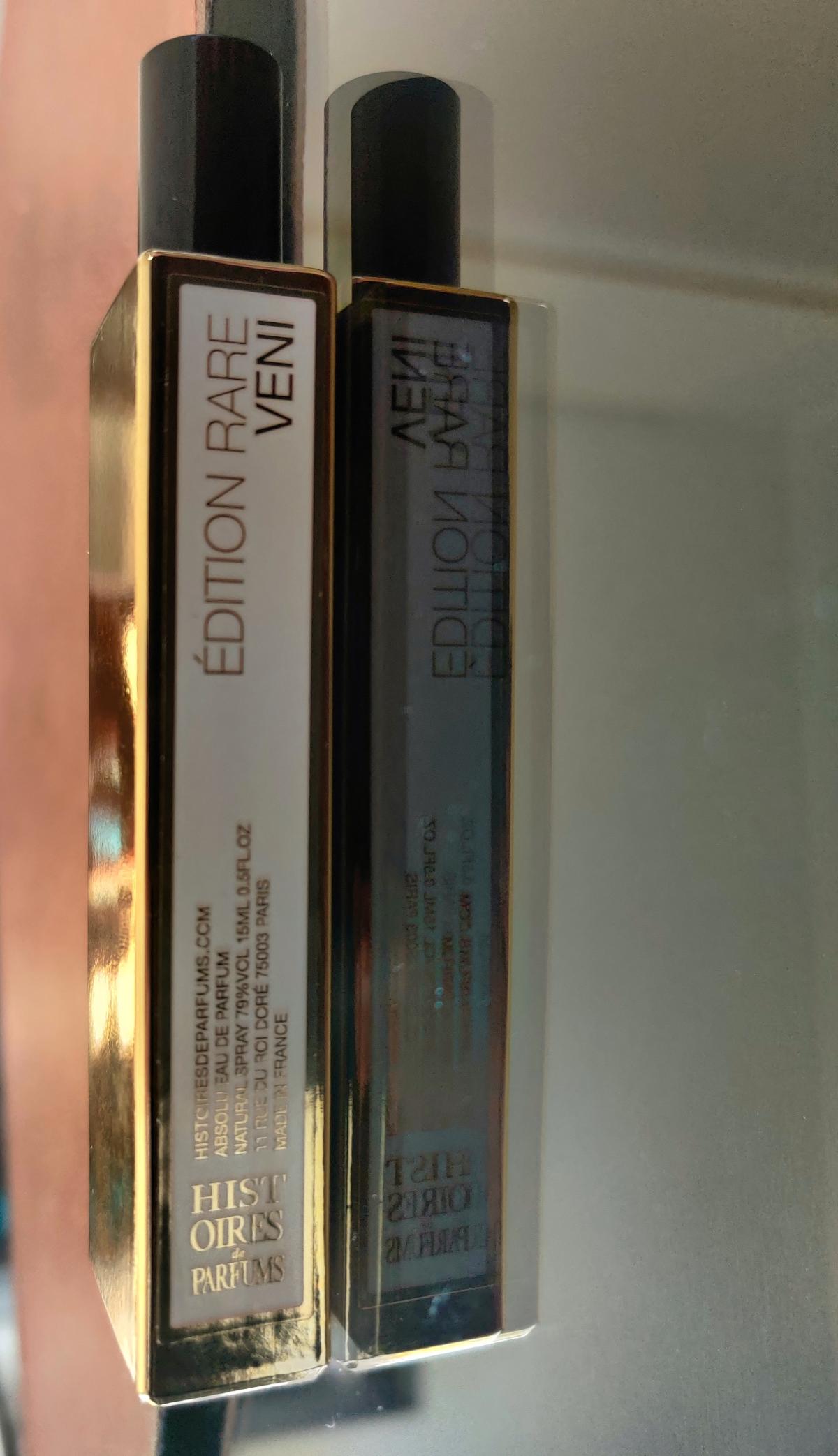 Veni podle Histoires de Parfums je Woody Spicy vůně pro ženy a muže. Veni byl/a uveden/a v roce 2012. Vrchní tóny jsou Kardamom, Skořice, Levandule a Galbanum; střední tóny jsouGuajakové dřevo, Šafrán a Aksamitník ; základní tóny jsou Ambra, Karamel, Vanilka, Benzoin, Pačuli, Pižmo a Dubový mech.