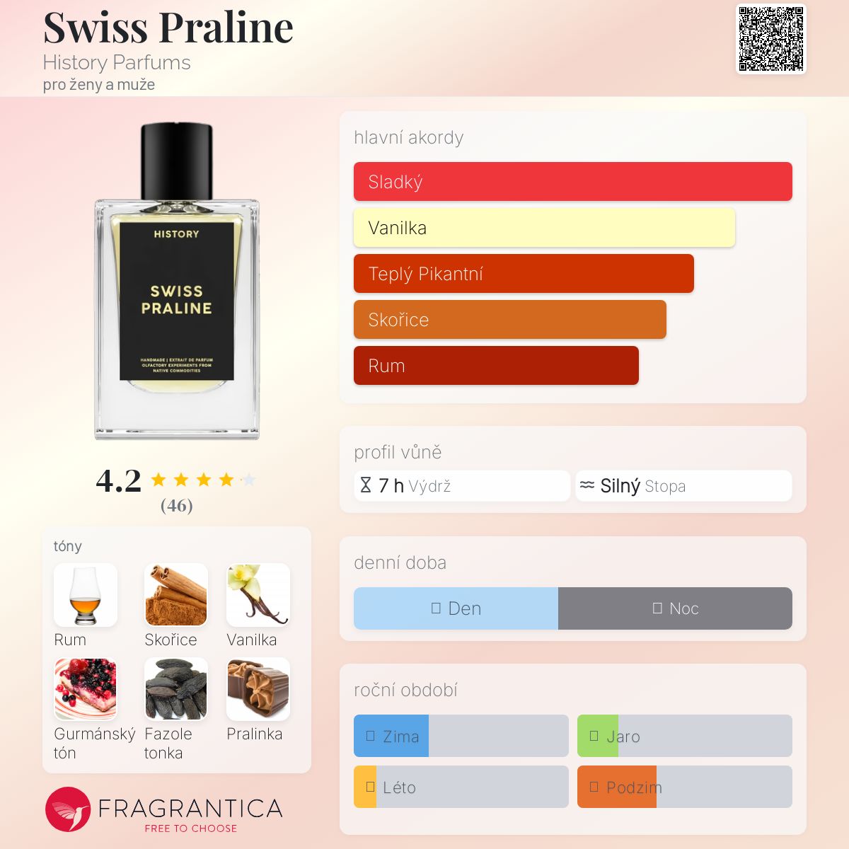 Swiss Praline podle History Parfums je vůně pro ženy a muže. Toto je nová vůně. Swiss Praline byl/a uveden/a v roce 2023. Vrchní tóny jsou Rum, Vanilka, Pralinka a Bergamot; střední tóny jsouSkořice, Fazole tonka a Dubový mech ; základní tóny jsou Gurmánský tón, Vanilka a Santalové dřevo.
