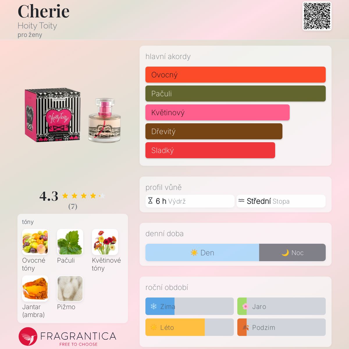 Cherie podle Hoity Toity je Floral Fruity vůně pro ženy. Cherie byl/a uveden/a v roce 2004. Vrchní tón je Ovocné tóny ; střední tón jeKvětinové tóny ; základní tóny jsou Pačuli, Jantar (ambra) a Pižmo.