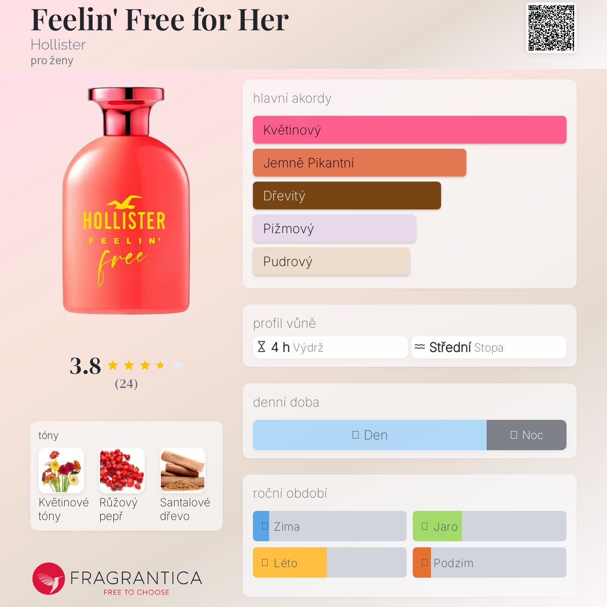 Feelin' Free for Her podle Hollister je Woody Floral Musk vůně pro ženy. Toto je nová vůně. Feelin' Free for Her byl/a uveden/a v roce 2024. Vrchní tón je Růžový pepř ; střední tón jeKvětinové tóny ; základní tón je Santalové dřevo.