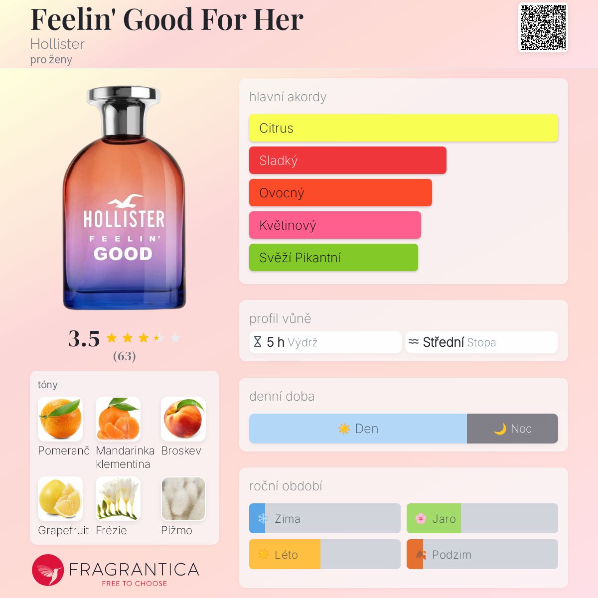 Feelin' Good For Her podle Hollister je vůně pro ženy. Feelin' Good For Her byl/a uveden/a v roce 2023. Vrchní tóny jsou Pomeranč, Mandarinka klementina a Růžový grapefruit; střední tóny jsouBroskev, Růžová frézie a Máta ; základní tóny jsou Pižmo, Vetiver a Dřevo cypřišku tupolistého.