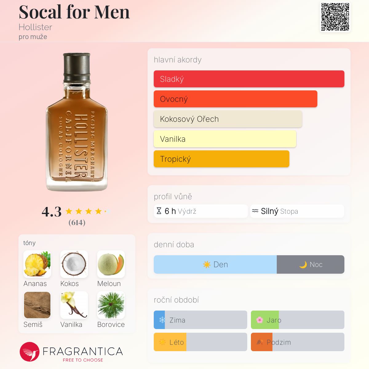 Socal for Men podle Hollister je Orientální Fougere vůně pro muže. Vrchní tóny jsou Ananas, Kokos a Meloun; střední tón jeBorovice ; základní tóny jsou Semiš a Vanilka.