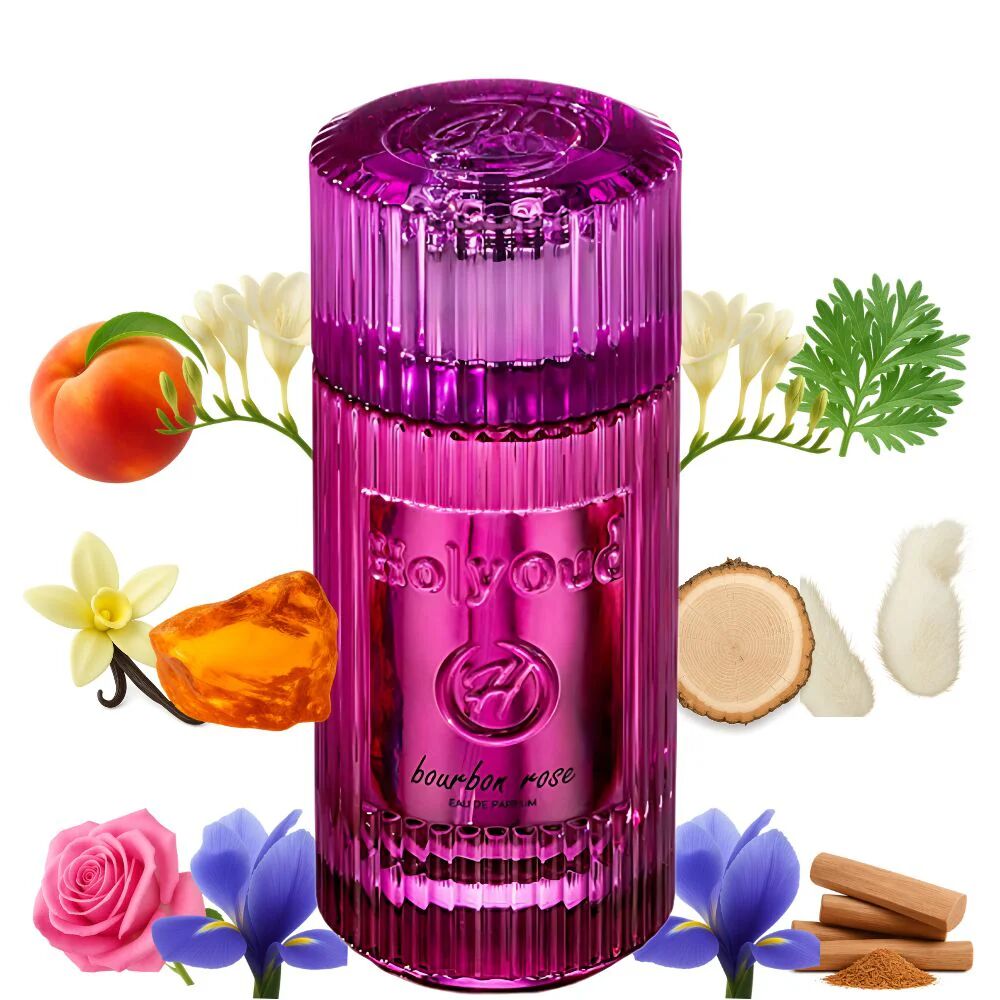 Bourbon Rose podle Holy Oud je Floral Woody Musk vůně pro ženy. Vrchní tóny jsou Broskev, Pelyněk a Frézie; střední tóny jsouJantar (ambra), Kašmírové dřevo, Vanilka a Pižmo ; základní tóny jsou Růže, Kosatec a Santalové dřevo.
