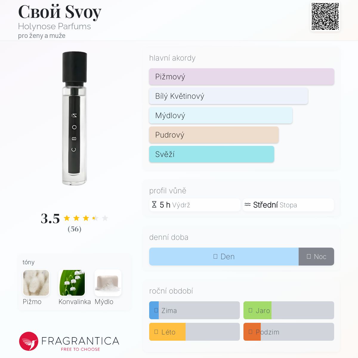 Свой Svoy podle Holynose Parfums je Floral Woody Musk vůně pro ženy a muže. Свой Svoy byl/a uveden/a v roce 2019. "Nosem" za touto vůní je Maria Golovina.