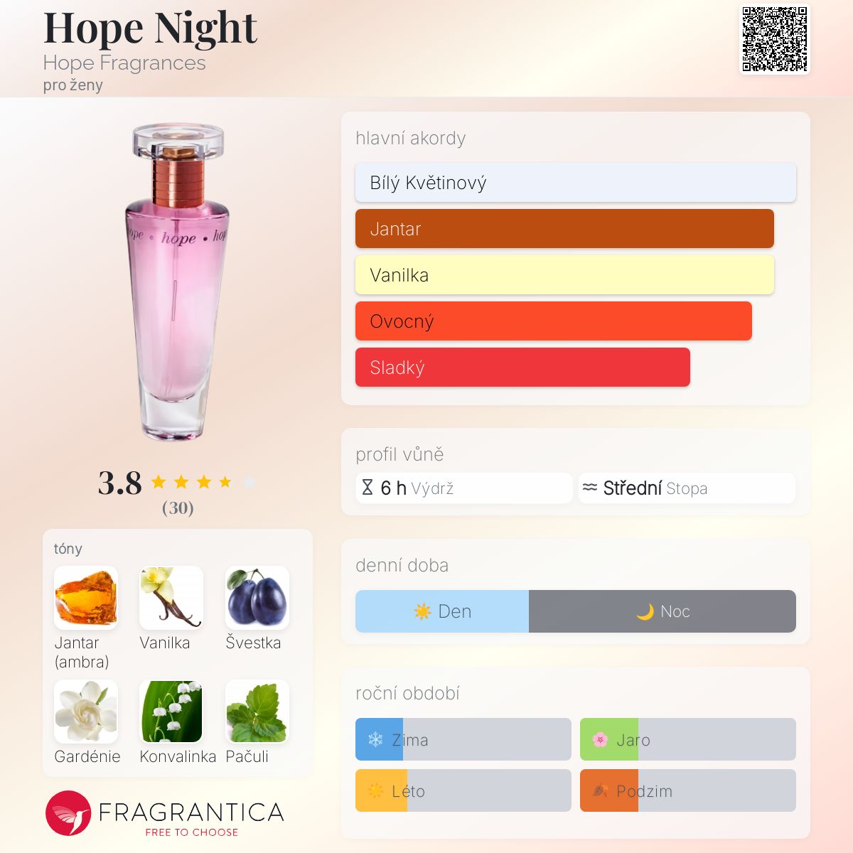 Hope Night podle Hope Fragrances je vůně pro ženy. Hope Night byl/a uveden/a v roce 2020. "Nosem" za touto vůní je Pierre Negrin.