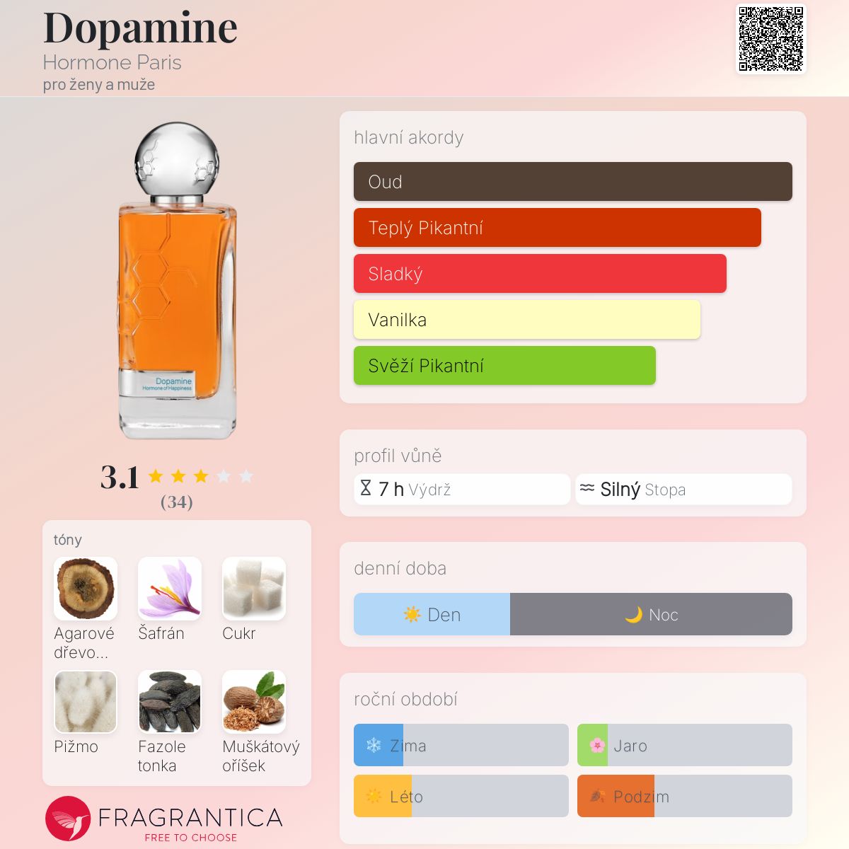 Dopamine podle Hormone Paris je Orientální vůně pro ženy a muže. Dopamine byl/a uveden/a v roce 2020. "Nosem" za touto vůní je Shadi Samra. Vrchní tóny jsou Šafrán, Muškátový oříšek a Levandule; střední tóny jsouAgarové dřevo (oud), Cukr a Vanilka ; základní tóny jsou Pižmo, Fazole tonka a Pačuli.