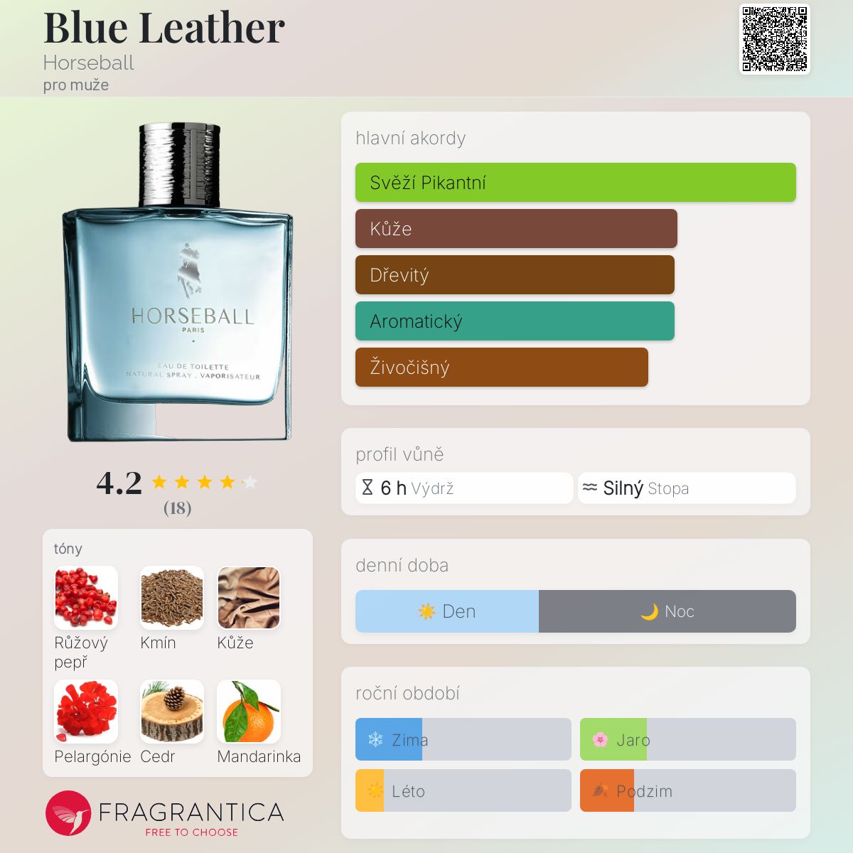 Blue Leather podle Horseball je Woody Aromatic vůně pro muže. Blue Leather byl/a uveden/a v roce 2015. Vrchní tóny jsou Mandarinka, Máta peprná a Grapefruit; střední tóny jsouRůžový pepř, Římský kmín a Pelargónie ; základní tóny jsou Kůže, Cedr a Pačuli.