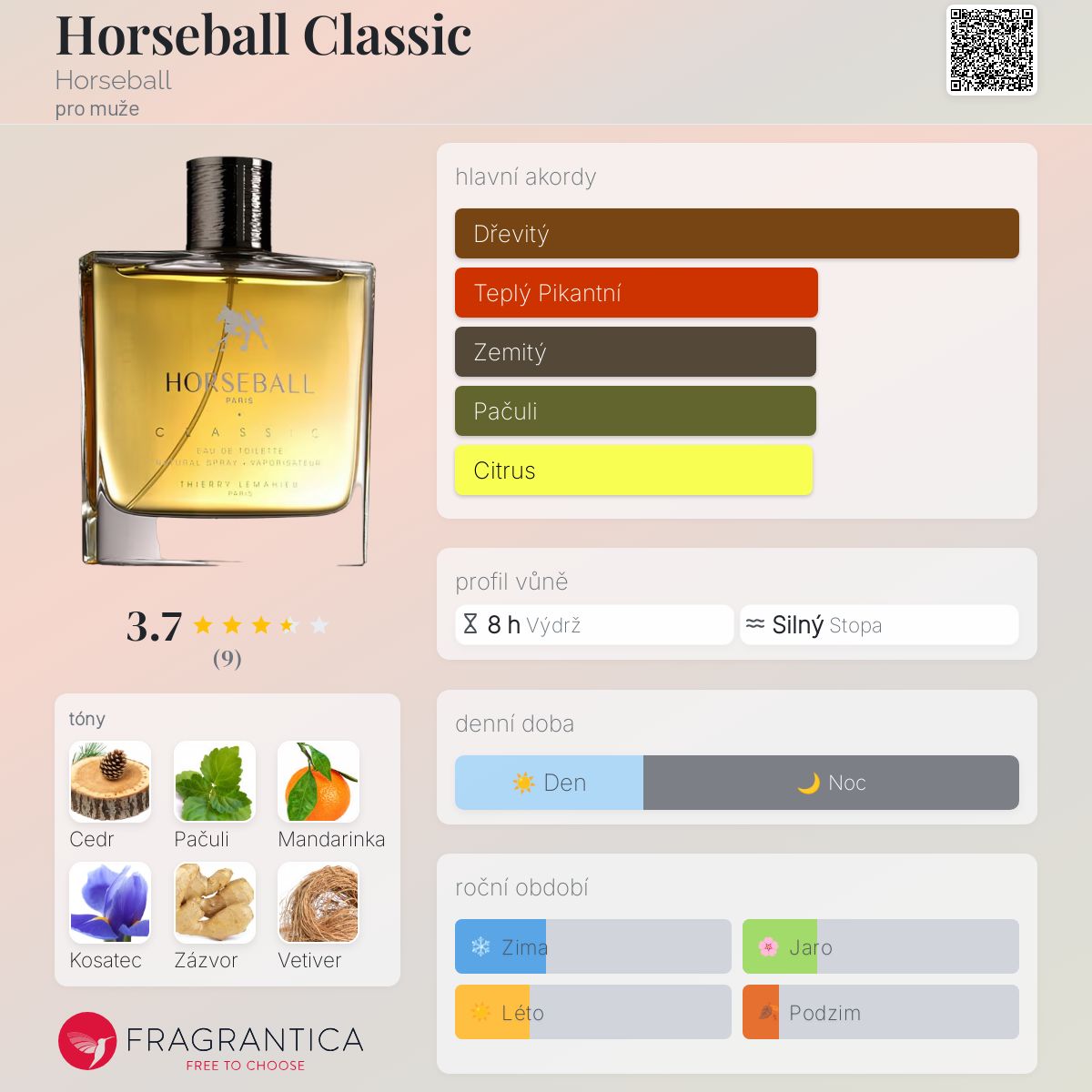 Horseball Classic podle Horseball je Orientální Woody vůně pro muže. Vrchní tóny jsou Mandarinka, Zázvor, Grapefruit a Citrón; střední tón jeKosatec ; základní tóny jsou Cedr, Pačuli a Vetiver.