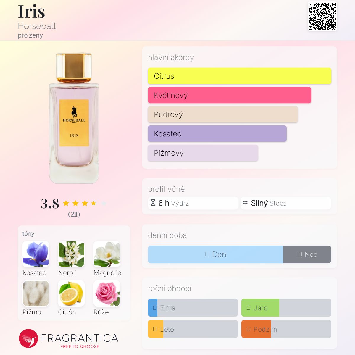 Iris podle Horseball je Floral vůně pro ženy. Iris byl/a uveden/a v roce 2015. Vrchní tóny jsou Neroli, Citrón a Mandarinka; střední tóny jsouKosatec, Magnólie a Růže ; základní tóny jsou Bílé pižmo, Vanilka a Santalové dřevo.