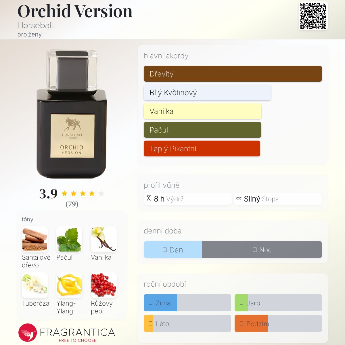 Orchid Version podle Horseball je Orientální Floral vůně pro ženy. Orchid Version byl/a uveden/a v roce 2010. Vrchní tóny jsou Růžový pepř, Černý rybíz a Bergamot; střední tóny jsouTuberóza, Ylang-Ylang a Jasmín ; základní tóny jsou Santalové dřevo, Pačuli a Vanilka.