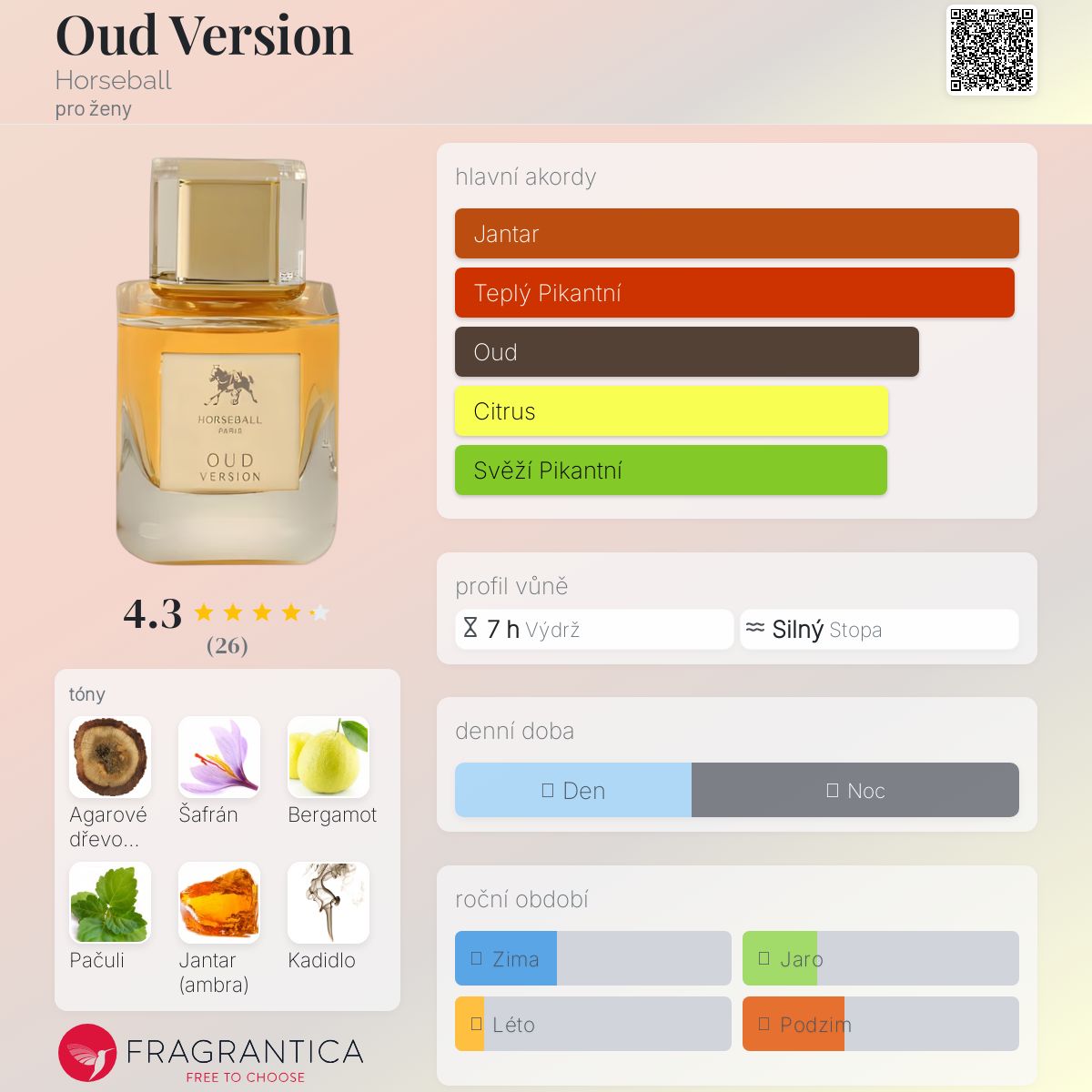 Oud Version podle Horseball je Orientální Woody vůně pro ženy. Oud Version byl/a uveden/a v roce 2011. Vrchní tóny jsou Bergamot, Pepř a Mandarinka; střední tóny jsouŠafrán, Kadidlo a Růže ; základní tóny jsou Agarové dřevo (oud), Pačuli a Jantar (ambra).