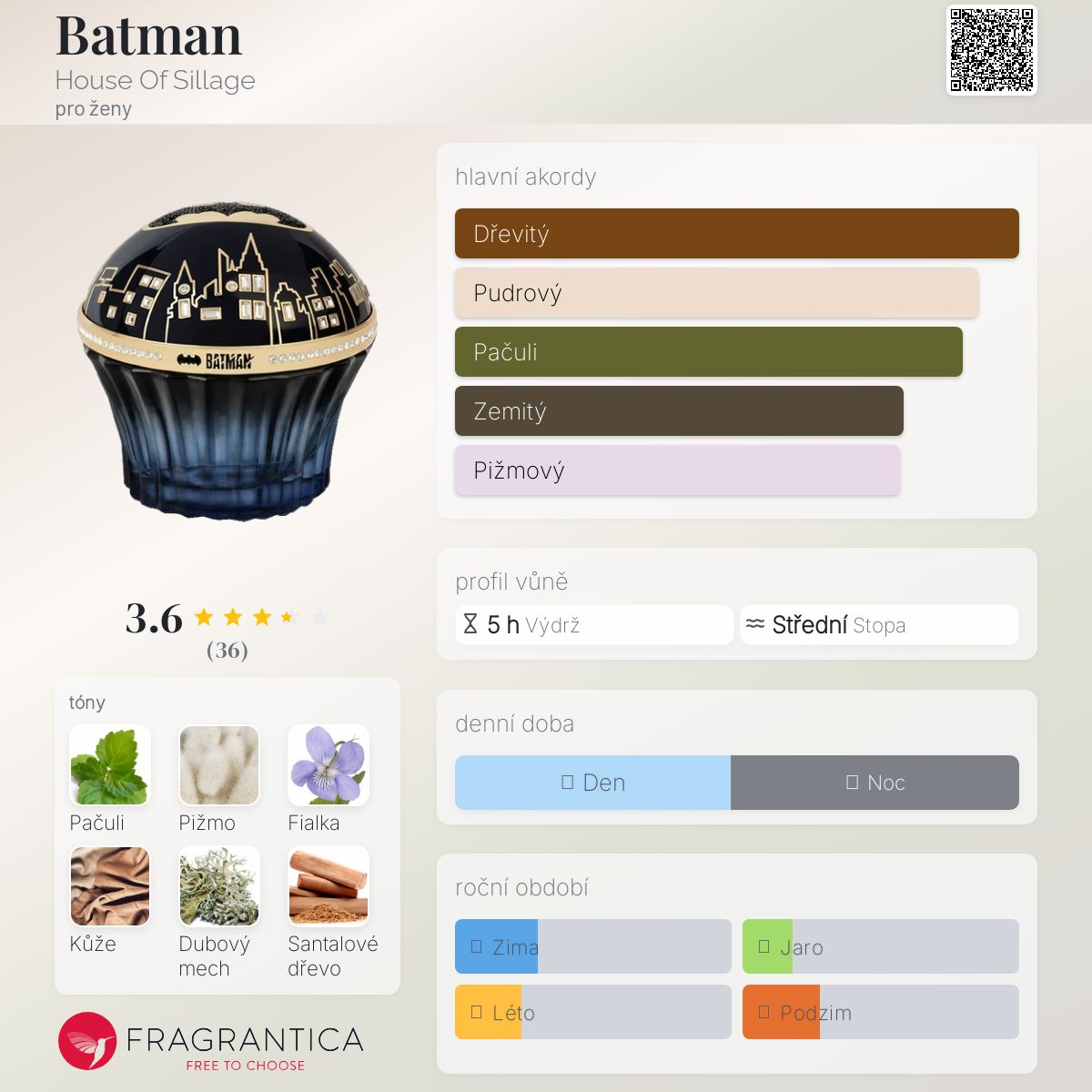 Batman podle House Of Sillage je vůně pro ženy. Toto je nová vůně. Batman byl/a uveden/a v roce 2024. Vrchní tóny jsou Jablko, Hruška a Magnólie; střední tóny jsouFialka, Kůže a Růže ; základní tóny jsou Pačuli, Pižmo, Mech, Santalové dřevo a Vanilka.