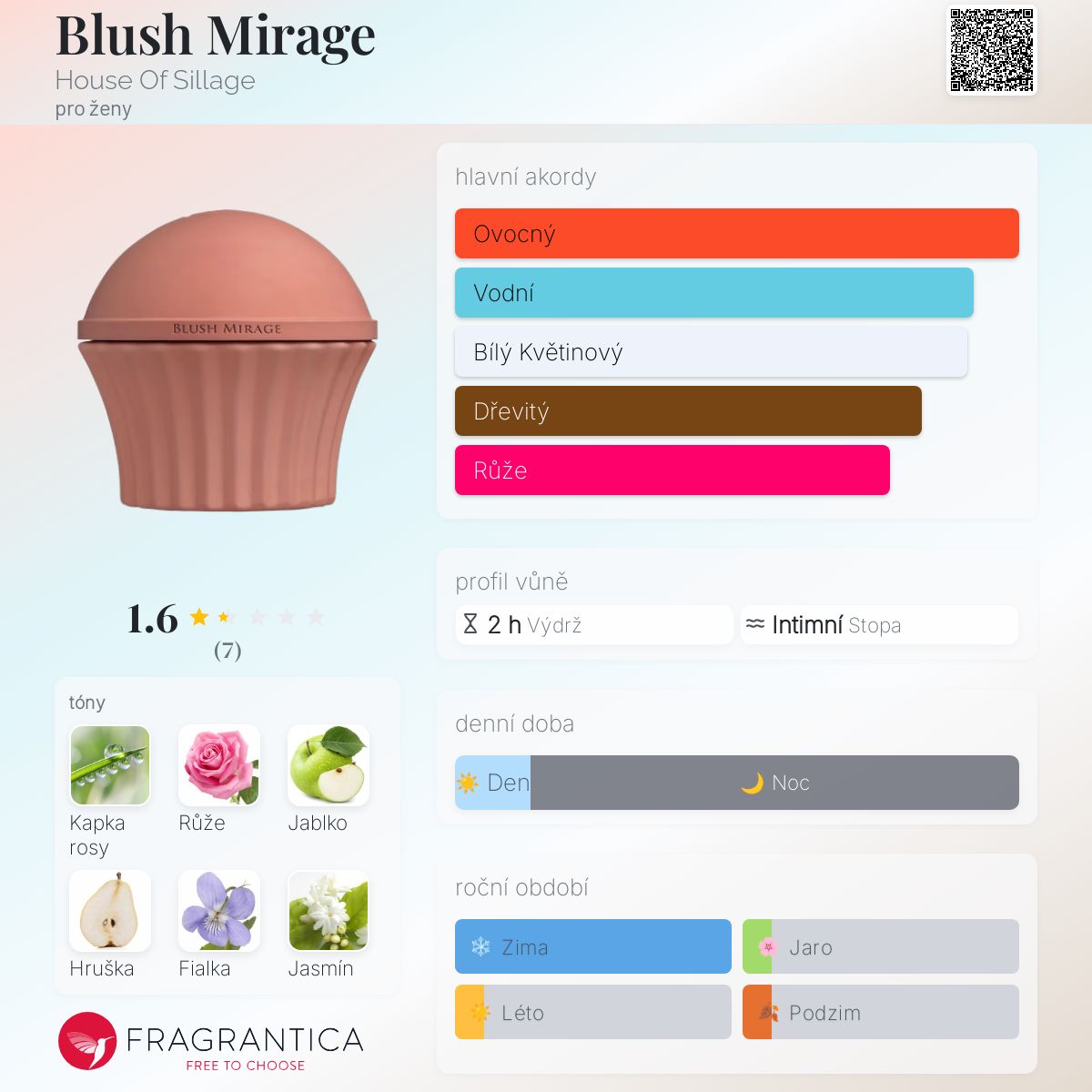 Blush Mirage podle House Of Sillage je Floral Fruity vůně pro ženy. Toto je nová vůně. Blush Mirage byl/a uveden/a v roce 2025. Vrchní tóny jsou Kapka rosy, Zelené jablko, Hruška a Bergamot; střední tóny jsouRůžová voda, Fialka, Jasmín mnohokvětý a Zimolez ; základní tóny jsou Jantarové dřevo, Virginský cedr, Santalové dřevo a Pižmo.