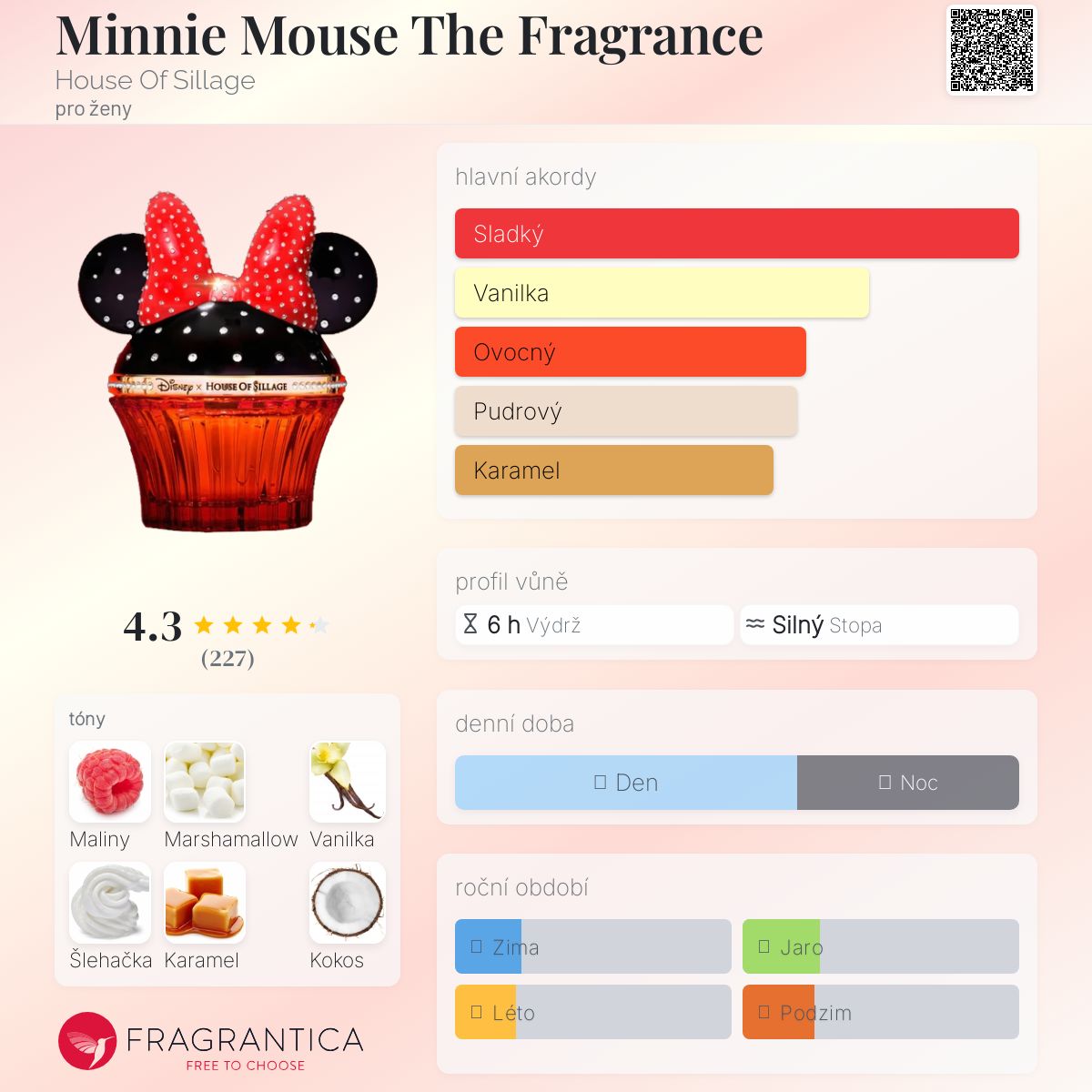 Minnie Mouse The Fragrance podle House Of Sillage je vůně pro ženy. Toto je nová vůně. Minnie Mouse The Fragrance byl/a uveden/a v roce 2022. Vrchní tóny jsou Marshamallow a Šlehačka; střední tóny jsouMaliny, Karamel a Kokos ; základní tóny jsou Vanilka, Pižmo a Cedr.